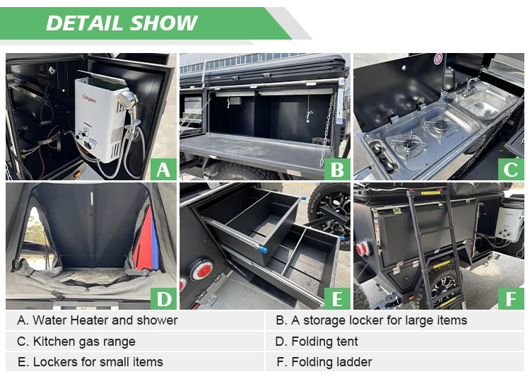 Portable Toilet;Outside shower with tent;Gas water heater;Fridger;Sunshade; High-quality waterproof top tent |
