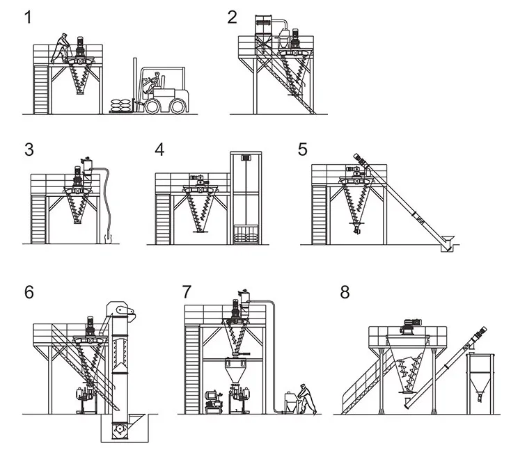Configuration 1: conical mixer with manually feeding. Configuration 2: conical mixer, manually feeding device with dust collector. Configuration 3: conical mixer with vacuum feeder. Configuration 4: conical mixer with crane. Configuration 5: conical mixer with screw conveyor. Configuration 6: conical mixer with bucket elevator. Configuration 7: simple production line with conical mixer, vacuum feeder, storage tank and auto-packing machine. Configuration 8: simple production line with conical mixer, manually feeding, screw conveyor to storage tank and auto-packing.