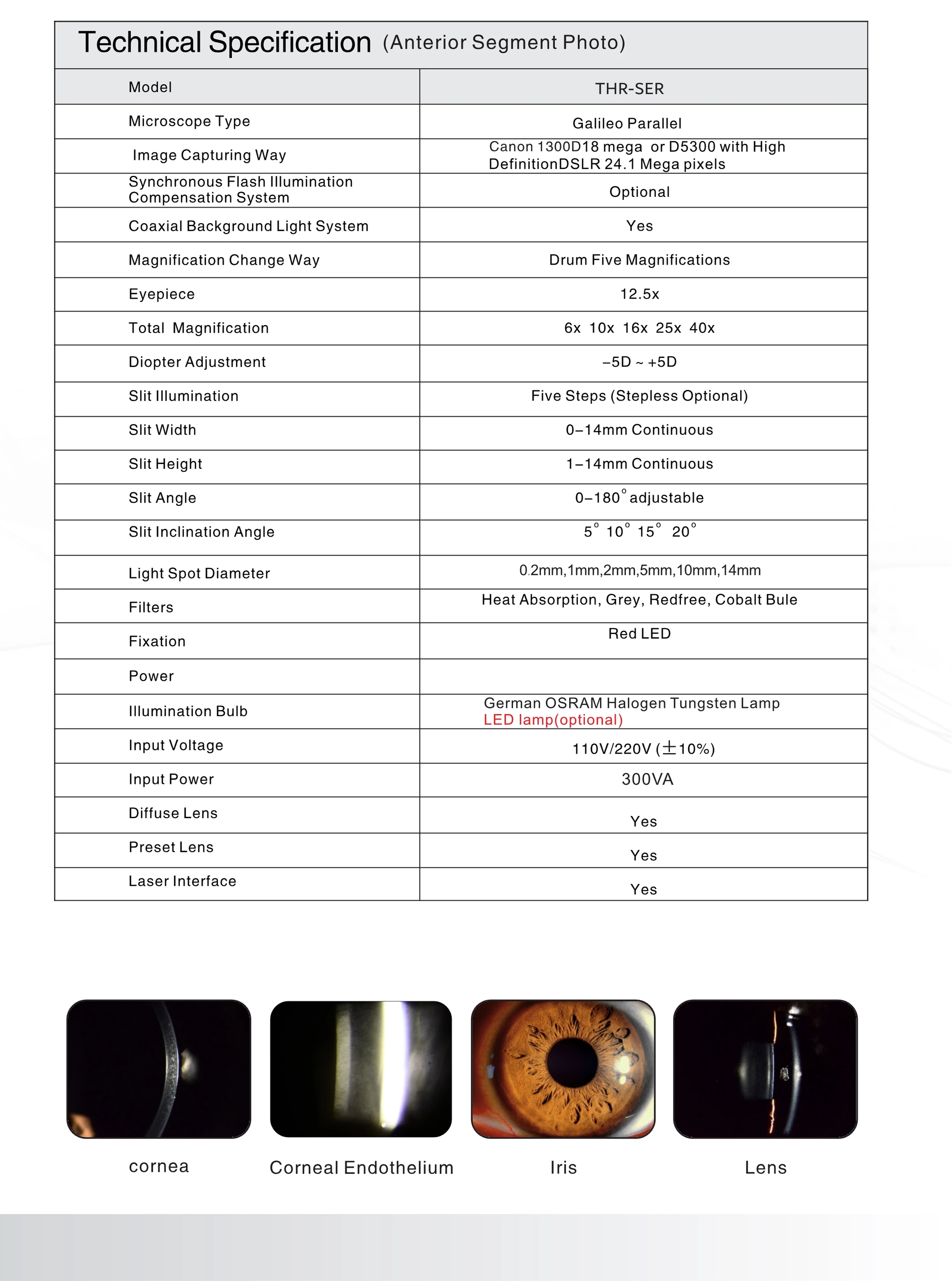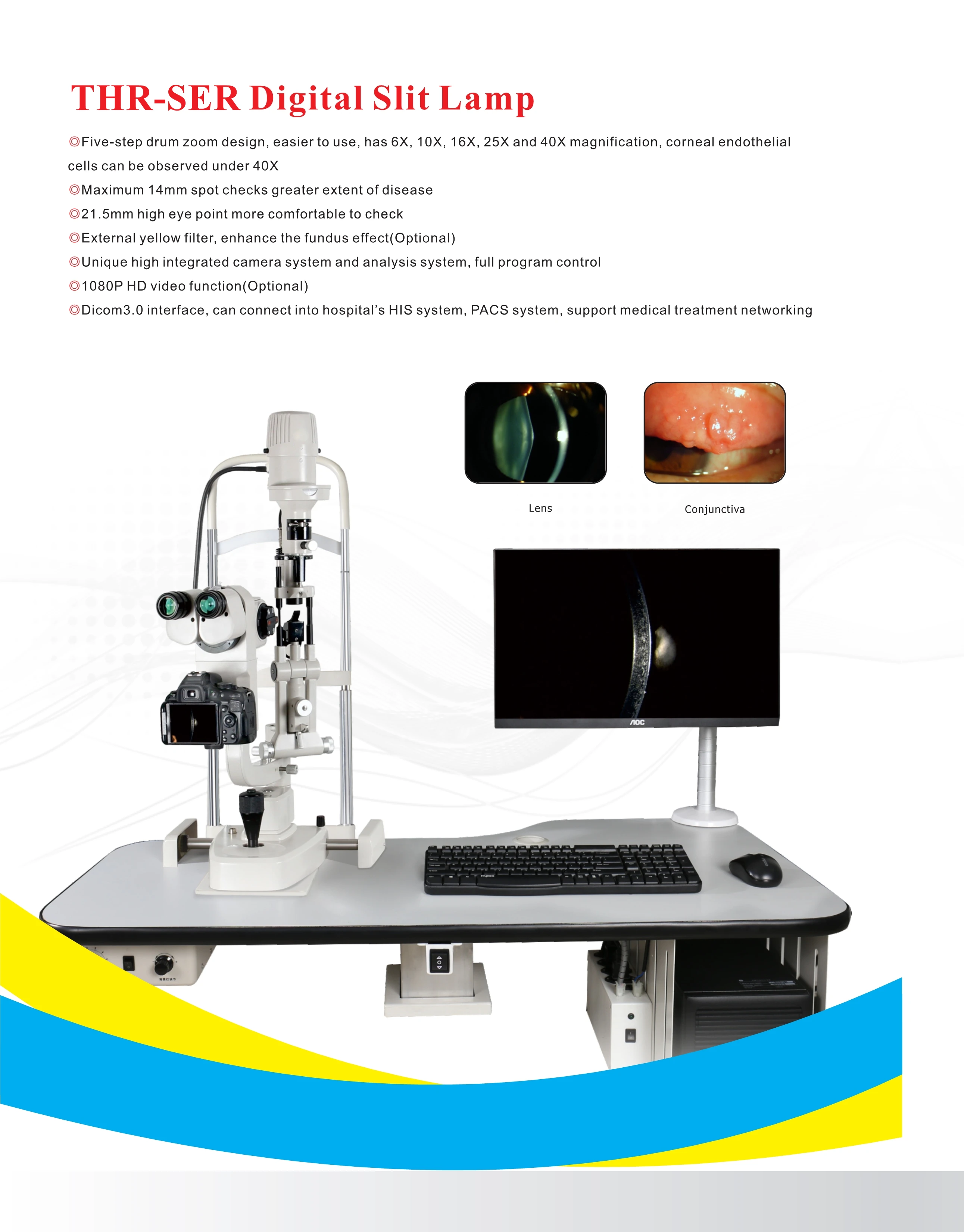 ◎Five-step drum zoom design, easier to use, has 6X, 10X, 16X, 25X and 40X magnification, corneal endothelial cells can be observed under 40X ◎Maximum 14mm spot checks greater extent of disease ◎21.5mm high eye point more comfortable to check ◎External yellow filter, enhance the fundus effect(Optional) ◎Unique high integrated camera system and analysis system, full program control ◎1080P HD video function(Optional) ◎Dicom3.0 interface, can connect into hospital’s HIS system, PACS system, support medical treatment networking