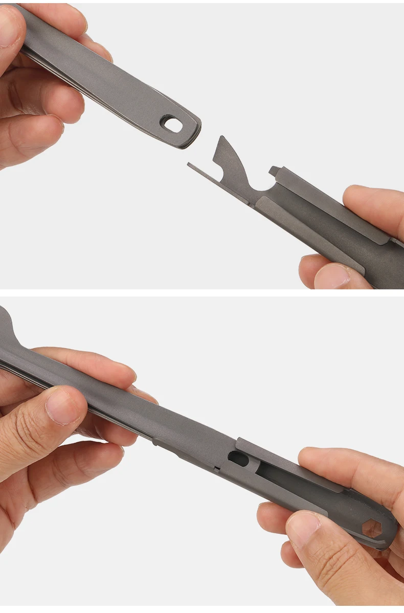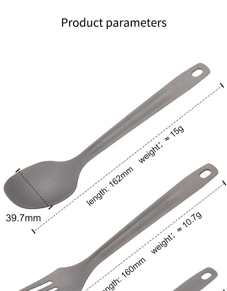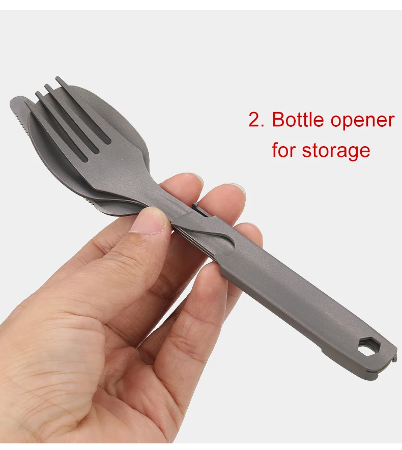 Rigid body design with cutouts. No more bendy plastic forks and knives that ruin your meal. Made with 100% Titanium. Sand blasted matte surface for grip Easily cleaned with a few wipes after meal Thin profile to slide into your backpack or meal containers use the included carabiner to keep the set together and carry in belt loops
