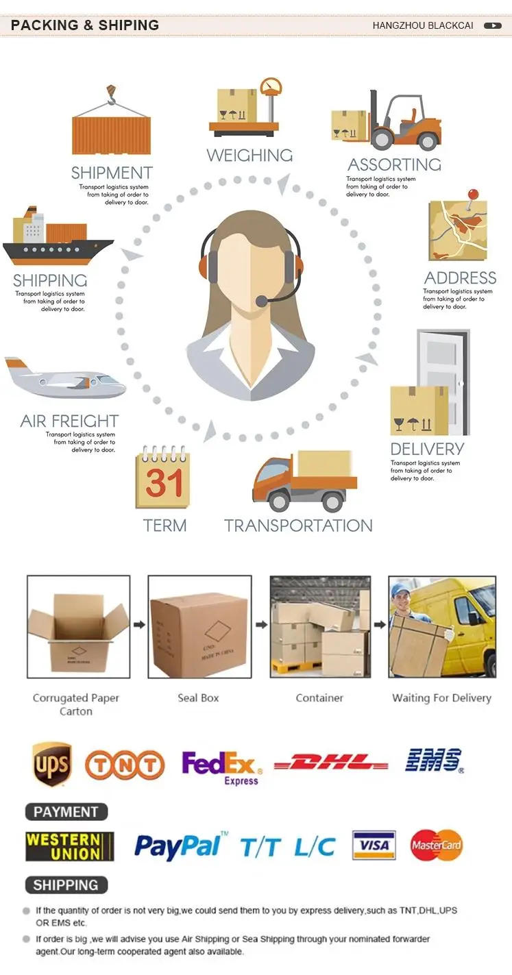 7.Q: What's the payment terms? Can I pay after you got the products? A: Normally we accept TT. L/C is also accepted if the order quantity is large. For old customers, we'll guarantee monthly payment after good cooperationship.