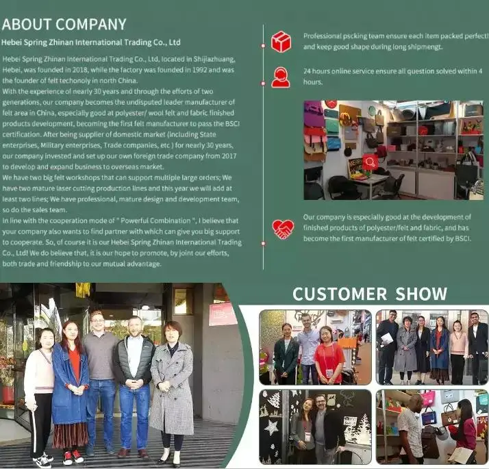 Our Hebei Spring Zhinan International Trading Co., Ltd is the founder in the production of felt in north China, we have two big felt workshops that can support multiple large orders; We have two mature laser cutting production lines and this year we will add at least two lines; We have professional, mature design and development team, so do the sales team. In line with the cooperation mode of "strong alliance", I believe that your company also wants to find companies with which can give you big support to cooperate. So, of course it is our HEBEI ZHENGWEI FELT!