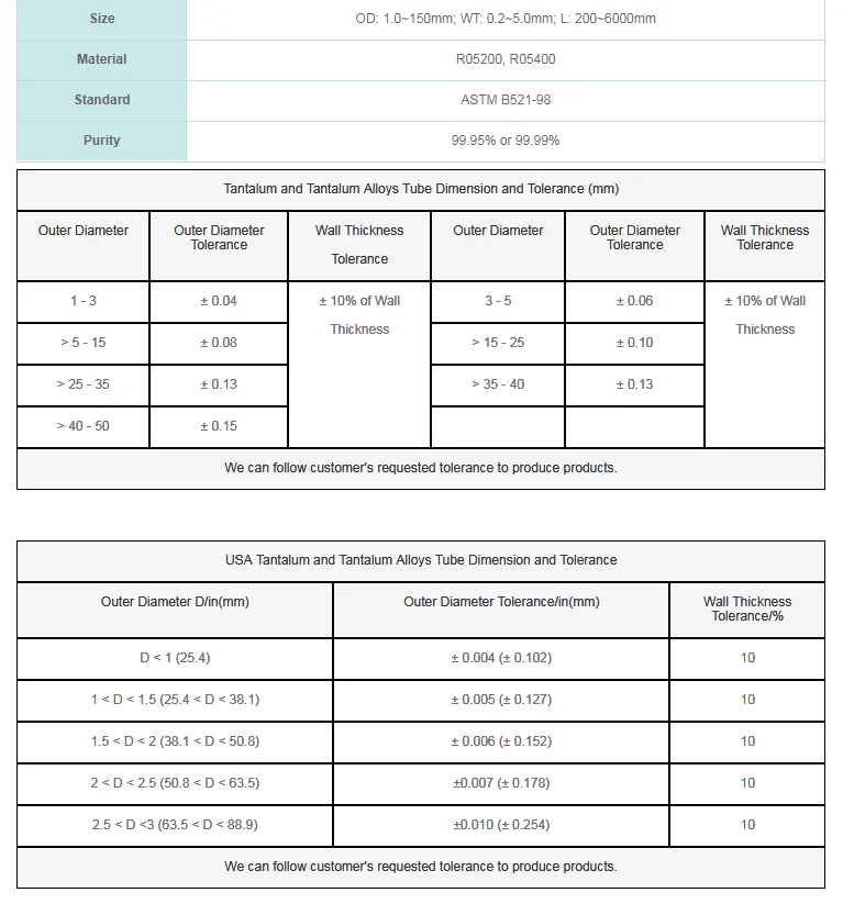 We produce pure tantalum tube, 90%Tantalum 10%Tungsten, 97.5%Tantalum 2.5%Tungsten, 60%Tantalum 40%Niobium tube in different dimensions to meet customers' request.