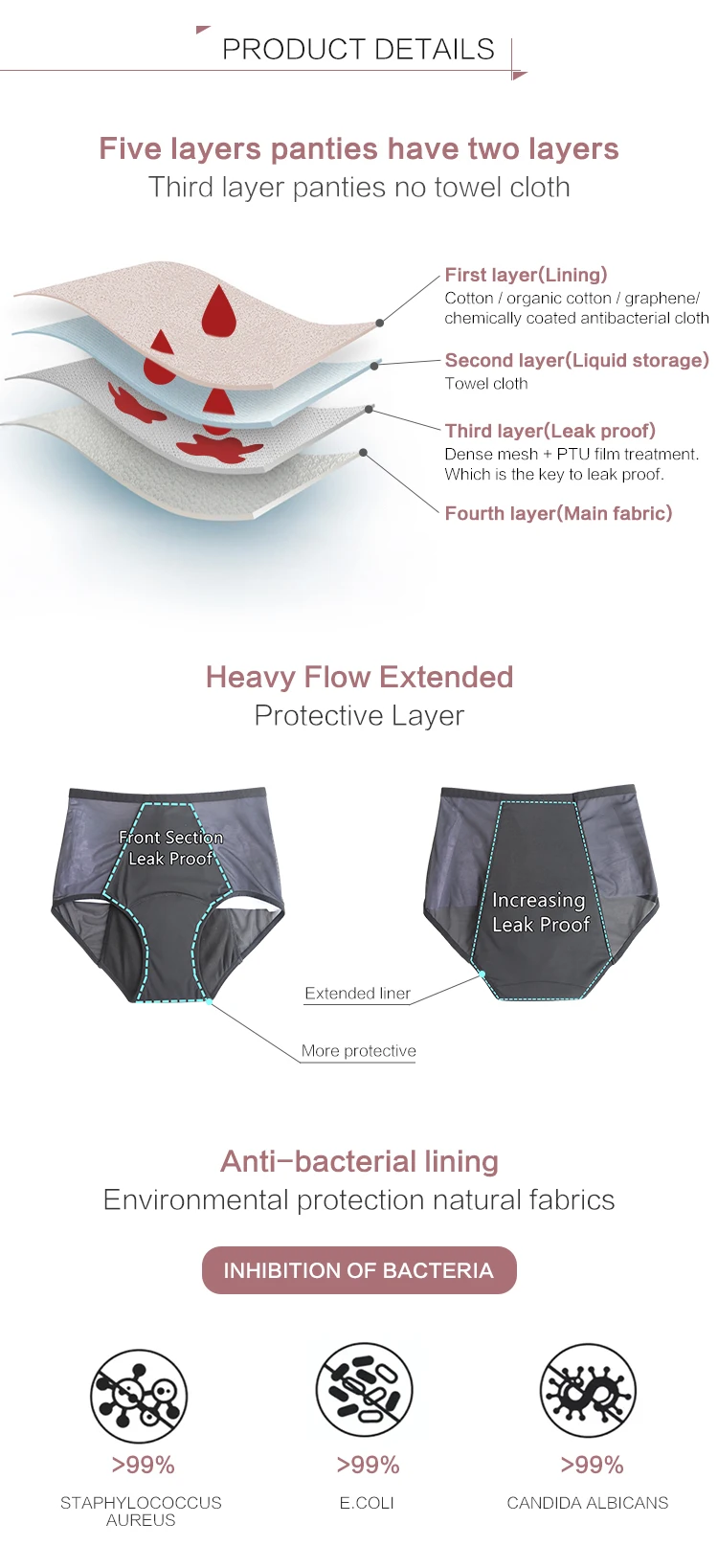 Four layers of absorbent and leak proof lining design, for days with menstrual cycle heavy flow, post delivery bleeding,postpartum recovery after c-section or light incontinence, avoid leakage embarrassments on pants or sheets.