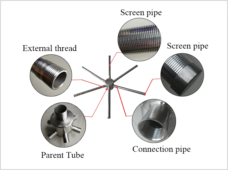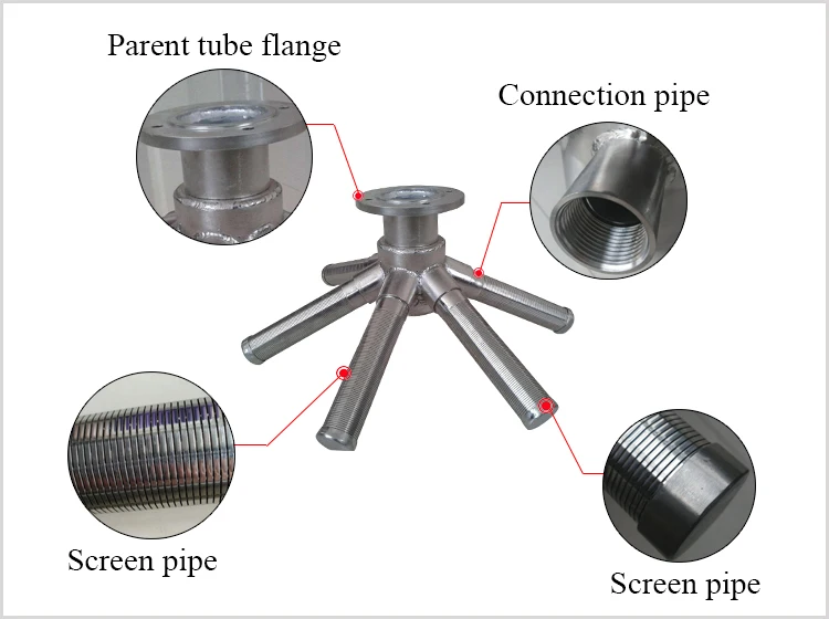 Stainless Steel Distributor Collector Lateral Header Filter for water industry filtration, also called header lateral assemblies, areHeader Lateral Distributor hub radial laters for water treatment assemblies of horizontal herring bone style wedge wire screen laterals and vertical secured round hub. The screen lateral has inherent even pattern, which is made of stainless steel, hastelloy alloy steel and other alloy steels. The screen lateral has various slot size, wire size and diameters to suit common or customized applications.