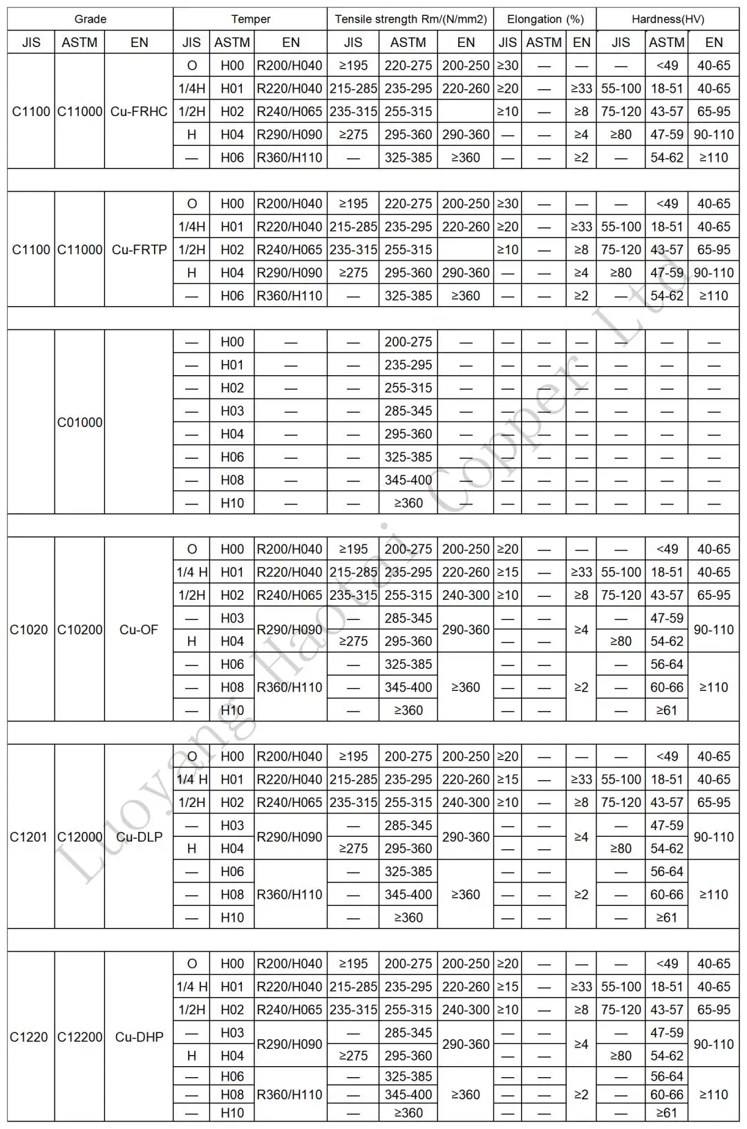 Grade | ASTM C10100,C10200,C10300,C10400,C10500,C10700,C10800, C10910,C10920,C10930,C10940,C11000,C11300,C11400, C11500,C11600,C12000,C12200,C12300,C12500,C14200, C14420,C14500,C14510,C14520,C14530,C14700,C15100, C15500,C16200,C16500,C17000,C17200,C17300,C17410, C17450,C17460,C17500,C17510,C18700,C19010,C19025, C19200,C19210,C19400,C19500,C19600,C19700,etc. JIS C1011,C1020,C1100,C1201,C1220,C1221,C1401,C1700, C1720,C1990,etc. EN Cu-OFE, Cu-HCP, Cu-PHC, Cu-ETP, Cu-DHP, Cu-DLP; CW009A, CW021A, CW020A, CW004A, CW024A, CW023A DIN OF-Cu, SE-Cu, E-Cu58, SF-Cu, SW-Cu. |