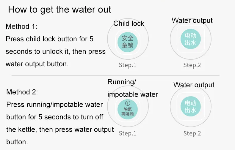 Child lock: | When the child lock is unlocked, if there is no opperation in 10 seconds, the child lock will automatically lock up. | ||||||