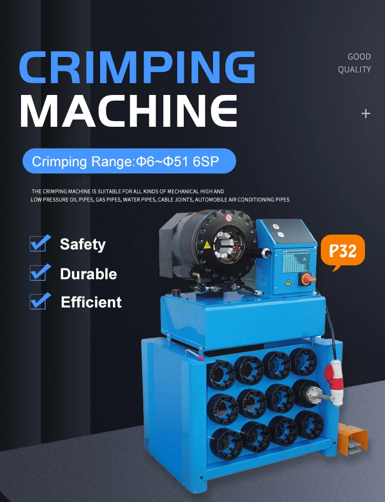 The crimping machine is suitable for all kinds of mechanical high and low pressure oil pipes, gas pipes, water pipes, cable joints, automobile air conditioning pipes, automobile power steering pipes, oil pipes, gasoline fuel supply pipes, as well as the buckles of construction parts and daily hot water pipes. Vehicles, engineering machinery, hydraulic machinery, welding and cutting equipment and other industries.