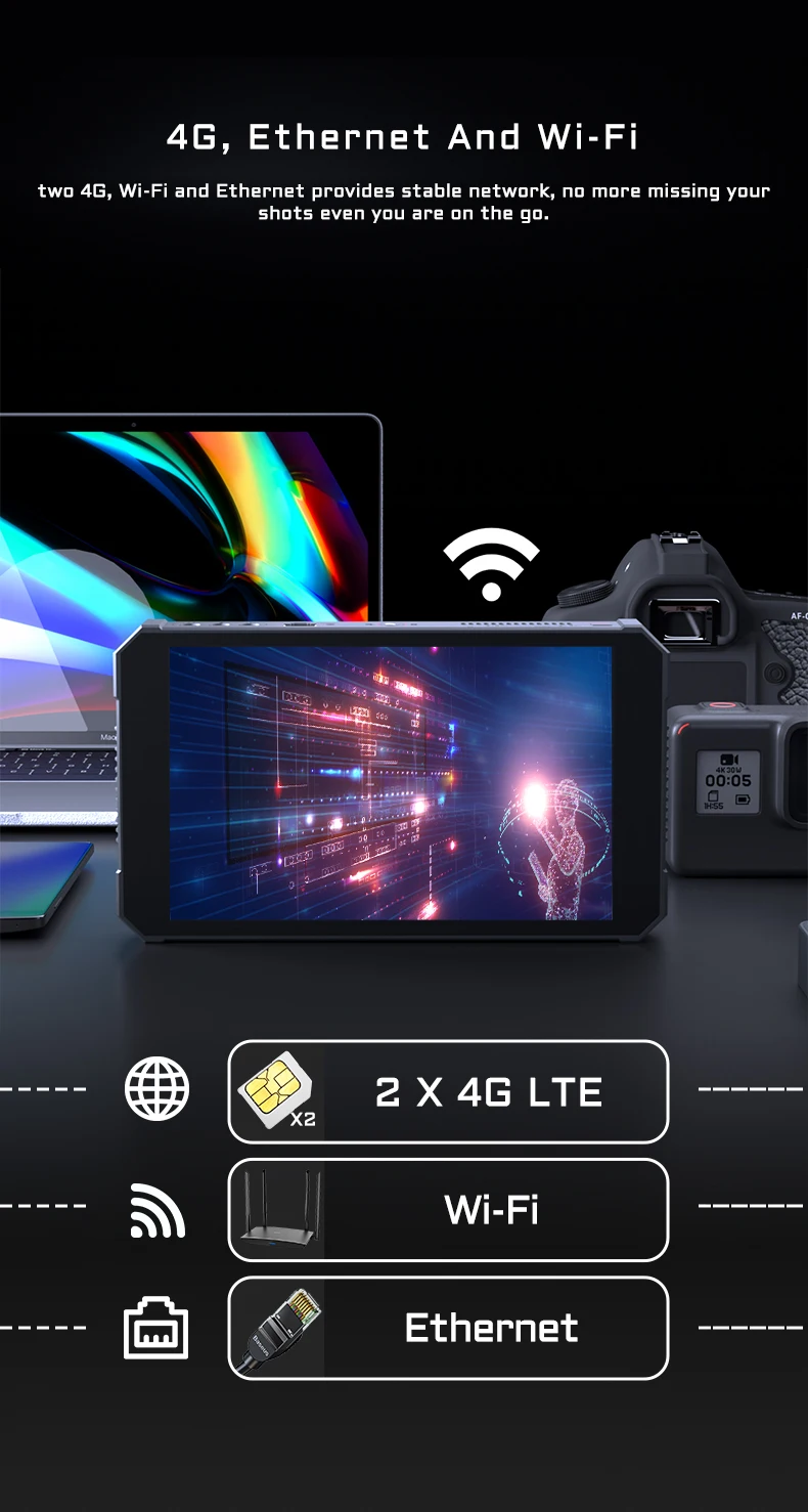 Create a live stream production from anywhere with the Portable Flydo from Oton Technology. The Flydo can live your streams via Wi-Fi, RJ45 Ethernet, or via 4G LTE with two separately available SIM card. If one 4G fails, you can then switch to another for safe option. The 8" touchscreen display shows the streaming image as well as the input streams; the LCD display also shows the control interface, which allows you to switch between the info sources with a touch.