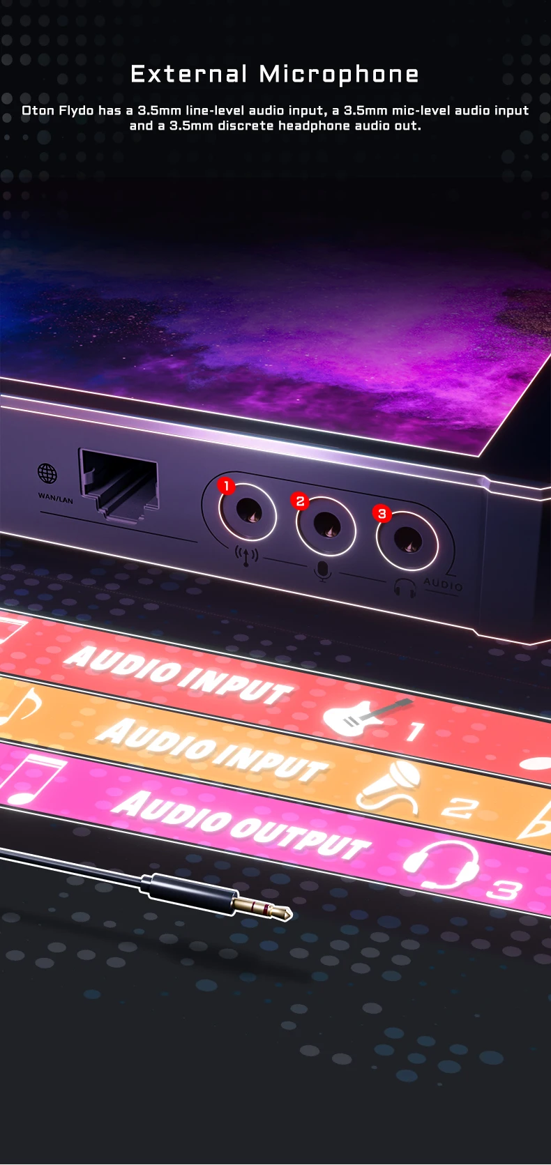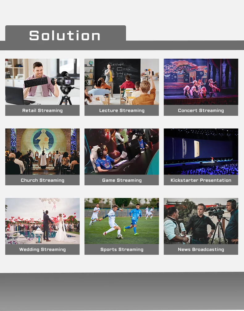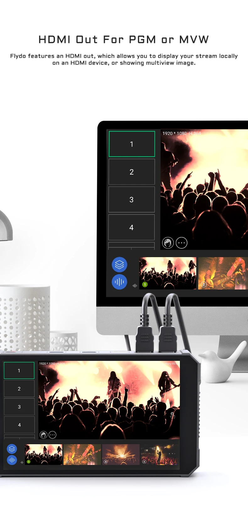 Flydo allows you to connect and live switch up to multiple video sources, including 2 HD-MI for cameras or drones, 2 USB for webcams or captures, import PDF, PowerPoint, images or MP4 videos from SD Card Input, or pulling stream from IP camera or CDN. It also features an HDMI output to display your stream locally on an optional HDMI display. It also has a line-level audio input, a mic-level audio input, and a discrete headphone audio out.