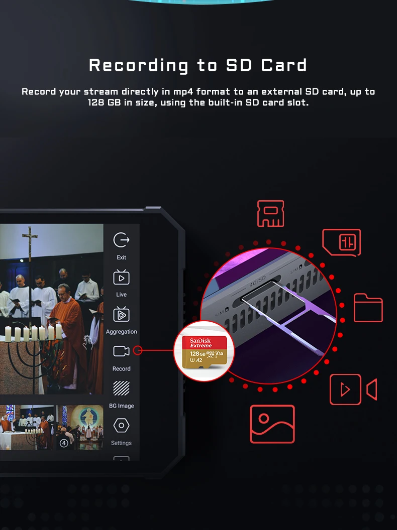 Flydo supports input resolutions ranging up to 4K using the H.264 or H.265 codec, and you can stream resolutions from 480p to 1080p to YouTube, Twitch, and other streaming services via custom RTMP or SRT presets. You can record your stream directly in .mp4 format to an optional SD card with up to 128 GB capacity using the built-in SD card slot.