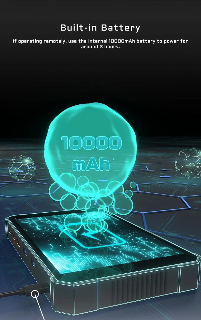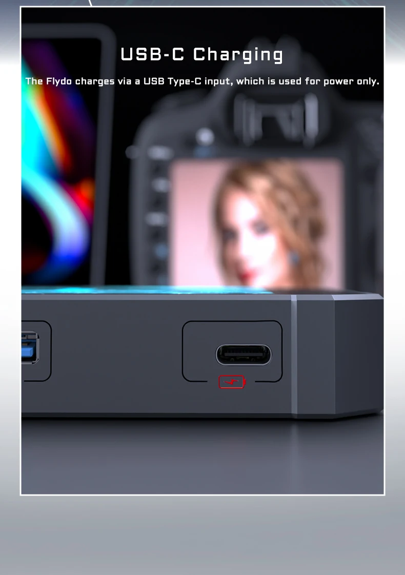 The internal 10000mAh battery can power your Flydo for approximately 3 hours. The Flydo charges via the USB connection, which is used for power only.