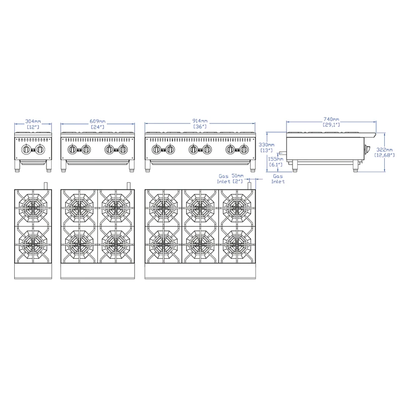 Model | Burners | BTU/h | Over all Dimensions | Net weight | Packing size | Gross weight |