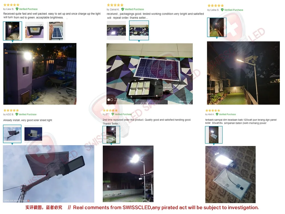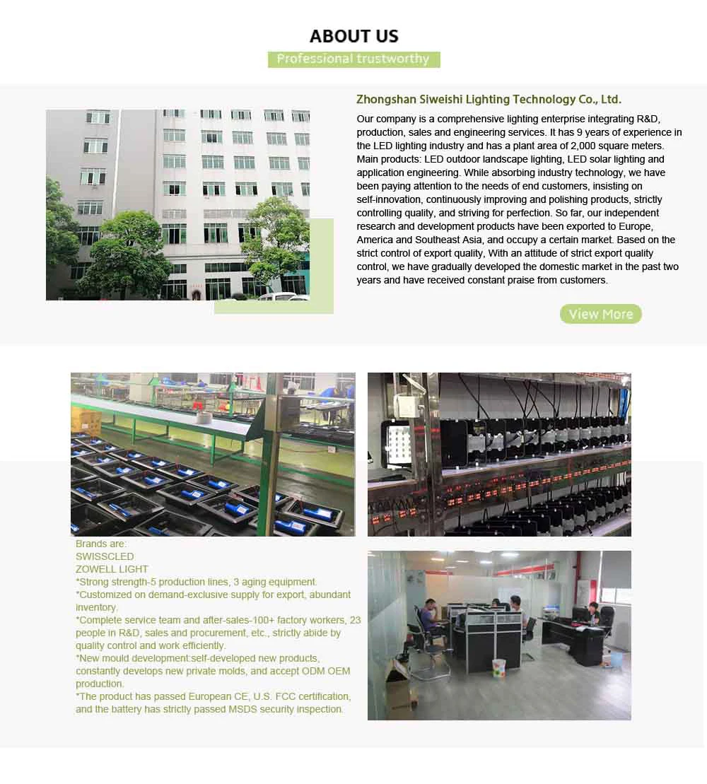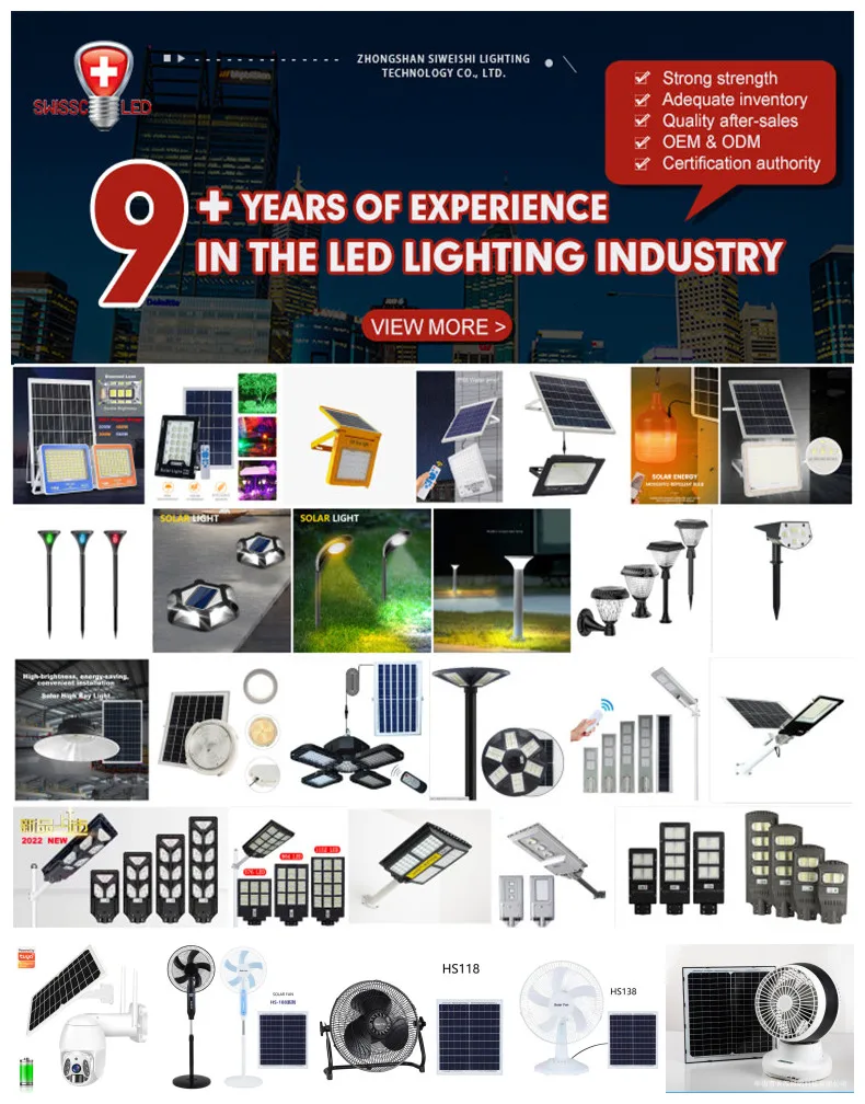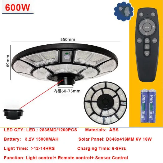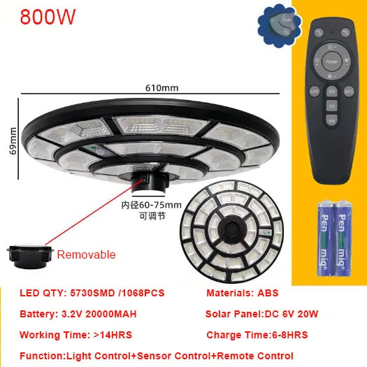 -Full brightness of UFO solar street light -Nice price with large battery capacity and high power solar panel. -Last time > 12hrs/day, Still very bright on the morning time 〈LiFePo4 Battery〉Larger Battery Capacity - Long Last Time . High quality of LiFePo4 lithium battery,High temperature resistance,Overcharge protection.Charging and Discharging Cycles >2000 times. 〈Long lifespan〉 50000HRS,2 Years warranty. 〈IP67 Waterproof 〉Thunderstorm protection Solar Flood Light, Reduce maintenance and service,rust-proof.