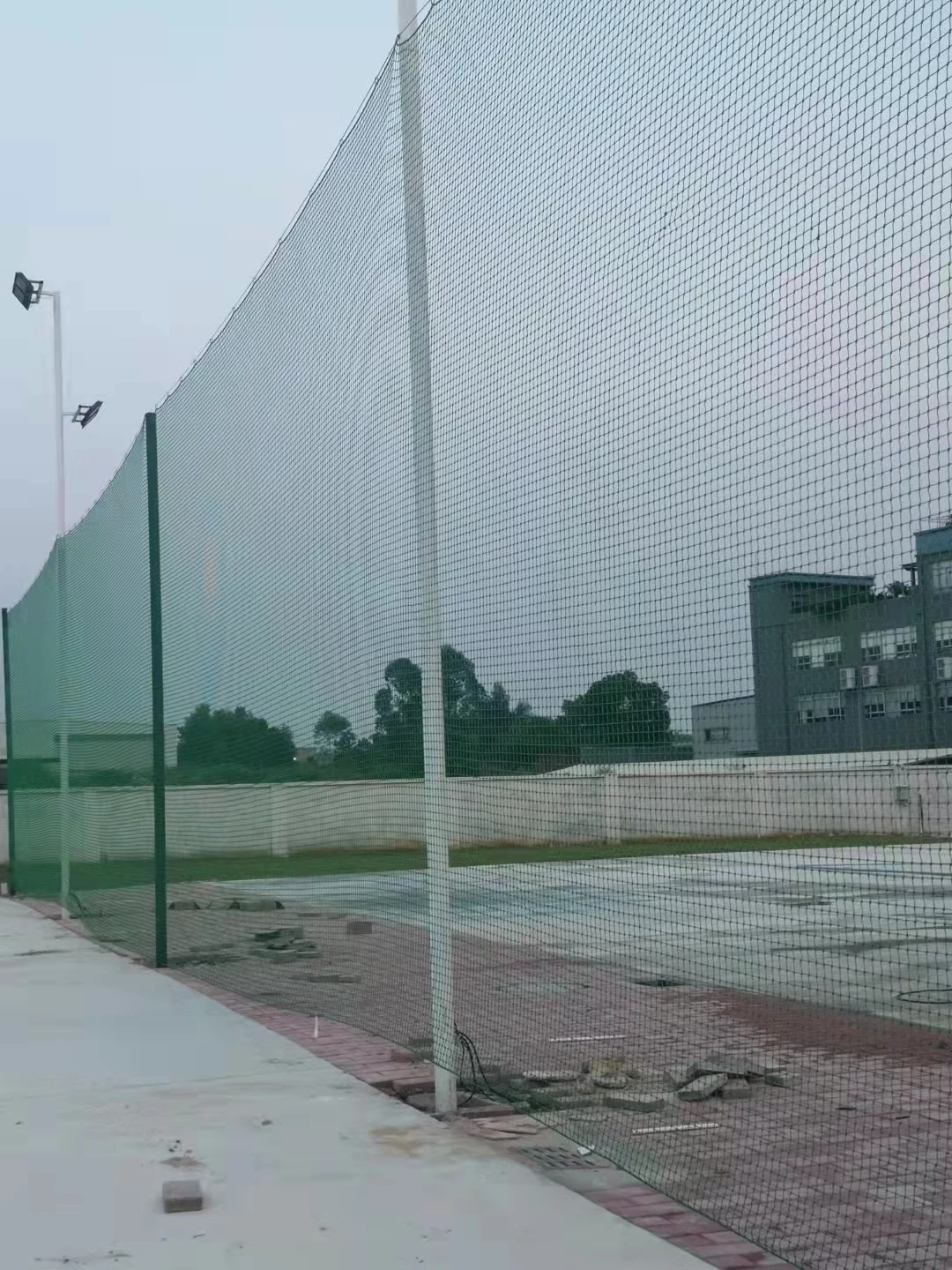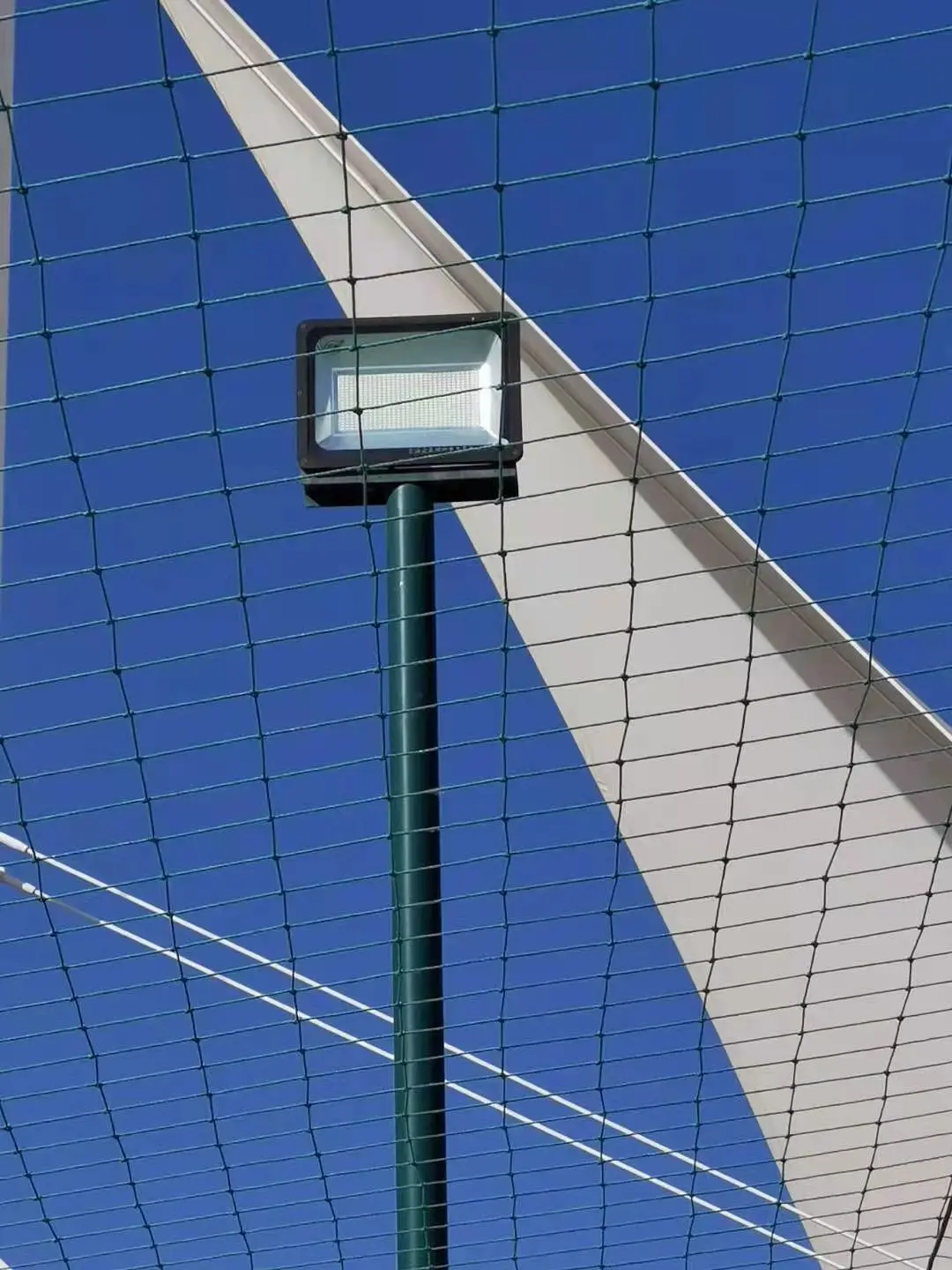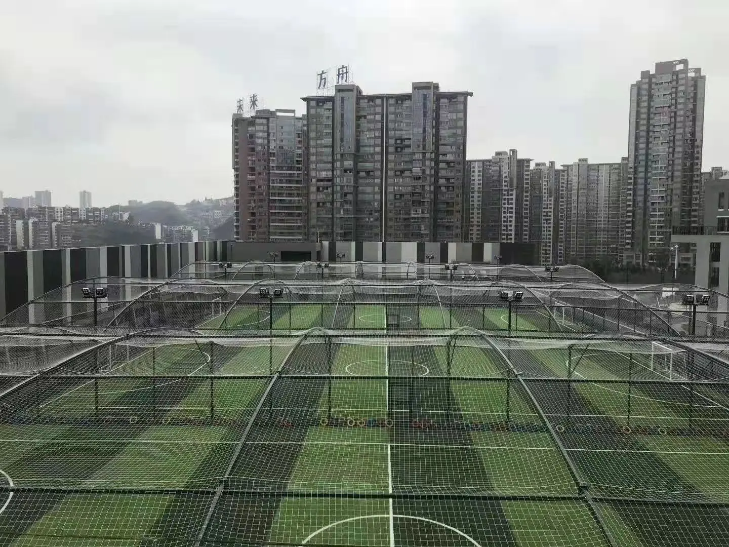 The sky net, which covers the top of the cage football field, effectively stops the ball from flying out.