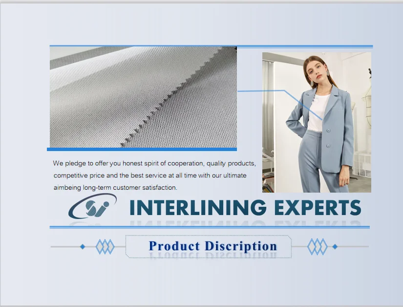 Product Characteristic | a. Perfect hand feeling after fusing, very plump,suitable for most fabrics bonding. b.Good bonding strength and dry cleaning resistance. c.Good laundry resistance up to 40 ℃ d.Eco-friendly e.PES coating.sutable for most of cloth . |