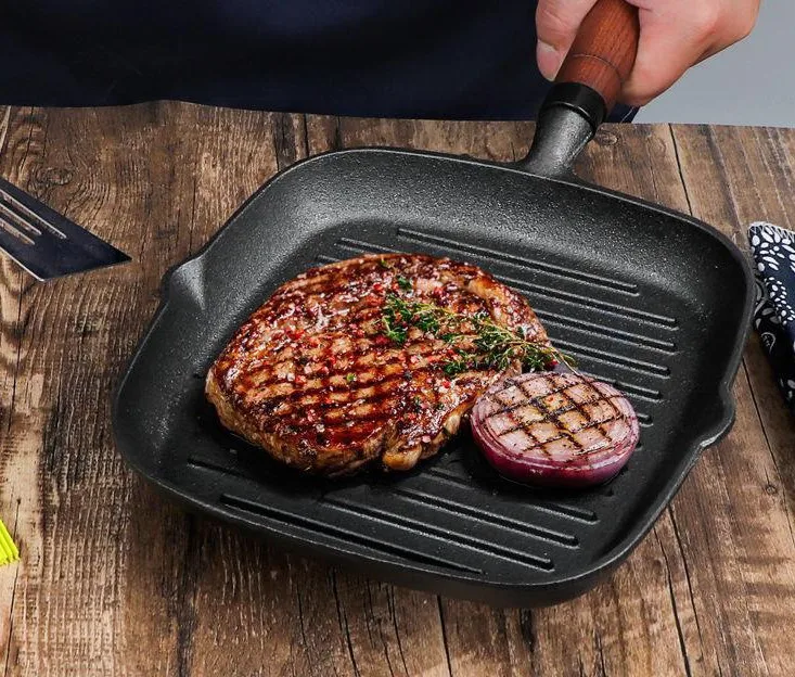 This square cast iron skillet features parallel ridges to lock the original gravy and leaving a nice grill marks on food.