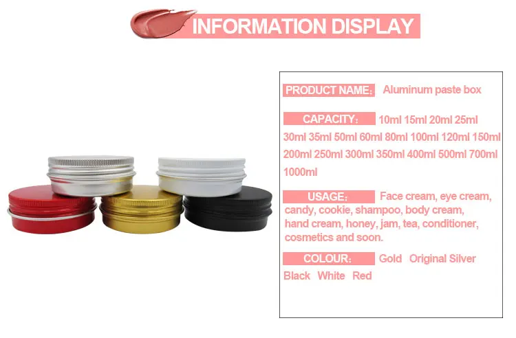 Product name | 5ml-250ml Round Screw Top Empty Tin Cans Cosmetic Cream White Matte Black Aluminum Jar Metal Tin | ||||