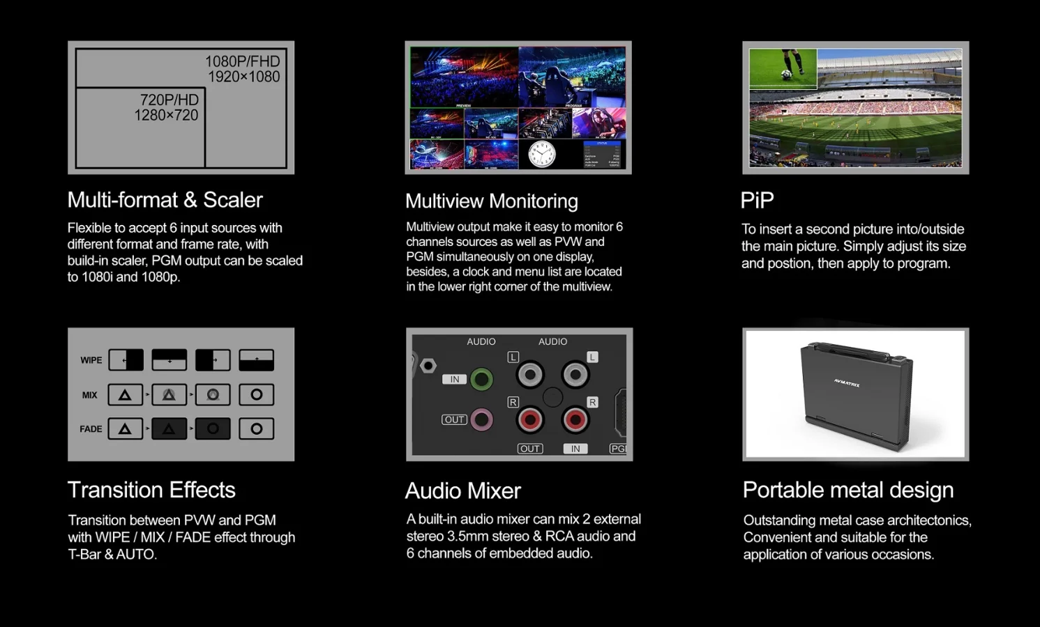 The all-in-one 6 cameras production video mixer can be widely used in various field events, such as live sports, virtual studio, Education, internet, concert, and so on
