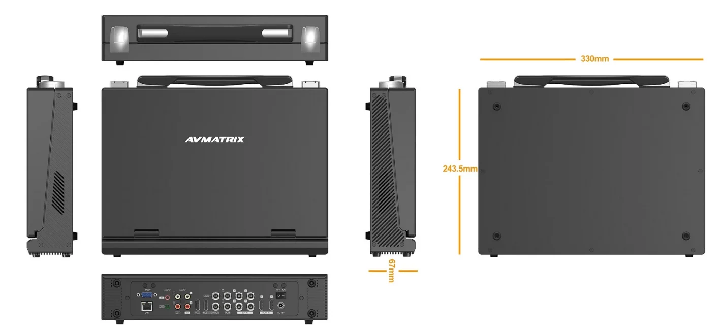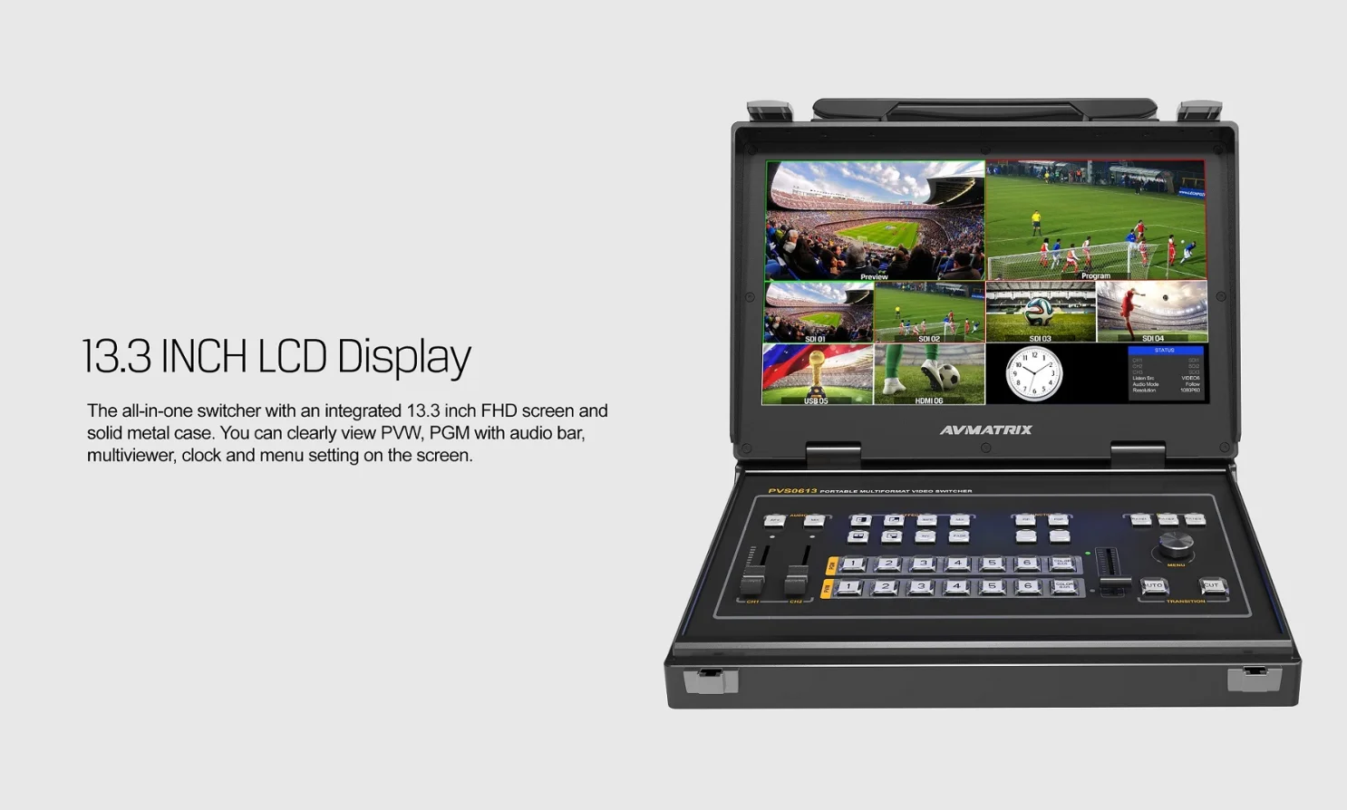 The all-in-one video switcher with an integrated 13.3 inch FHD screen and solid metal case. You can clearly view PVW, PGM with audio bar, multiview, clock, and menu setting on the screen.