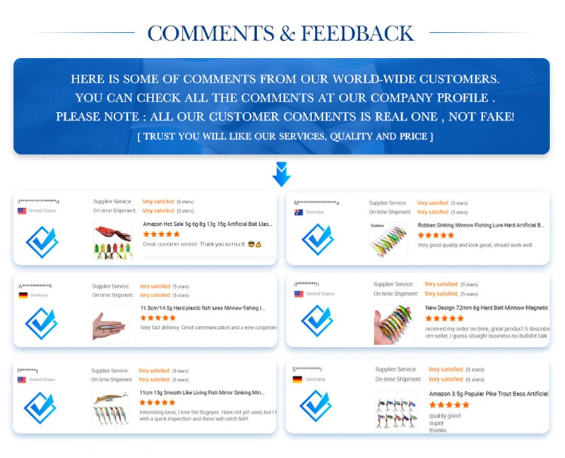Free Sample: We are very willing and support our customers to test the quality of our products. As long as you are a fishing business Partner, we can provide Free Samples for you. (Not included Shipping Fee)
