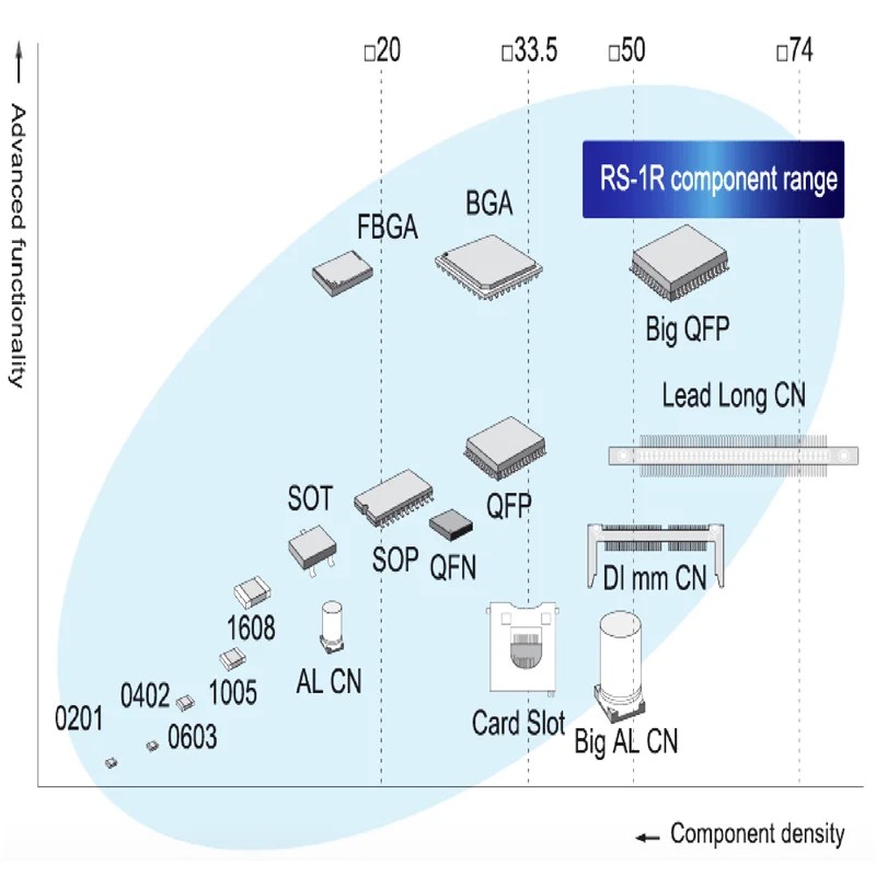 RS-1R supports components from 0201*1(metric) up to 74mm square or 50x150 retangular parts. Component height up to 25mm