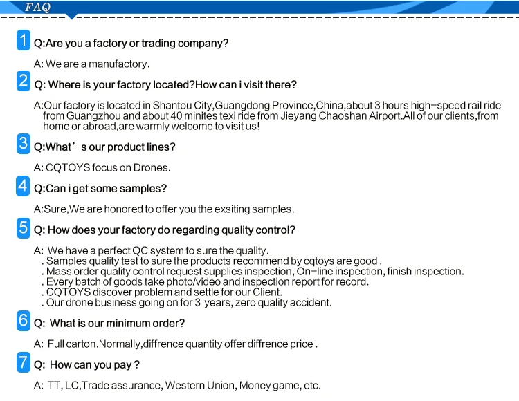 Accend,Decend,Forward,Backward,Turn Left/Right,Left/Right Rotate,Altitude Hold,One Key Take Off/Landing/Stop,Headless Mode/Auto Return,Low/Mid/High Speed Switch,180 Degree Flip,360 Degree Rotate Camera optional( Photography or Video) | ||||||||