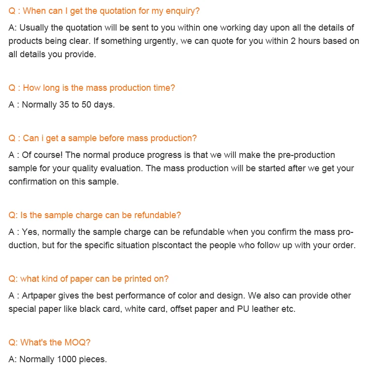Surface Finishing | Options: Glossy/ Matte Lamination, Vanishing, Aqueous Coating, Flocking, Gold / Silver hot stamping (foil), Debossed/ Embossing,Texture, Spot UV as Following Pictures and Videos. | |||||||||||
