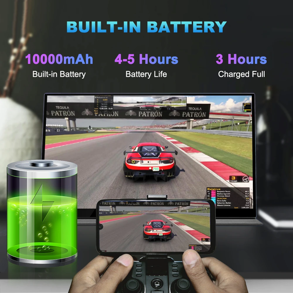 The portable monitor built-in 10000mAh polymer battery not only provide power supply for the monitor to work, but also can be used as power bank to reverse charge mobile phones. Once fully charged could last for up to 5 hours if closed the reverse charge function; or 4 hours if open the reverse charge for your phone.