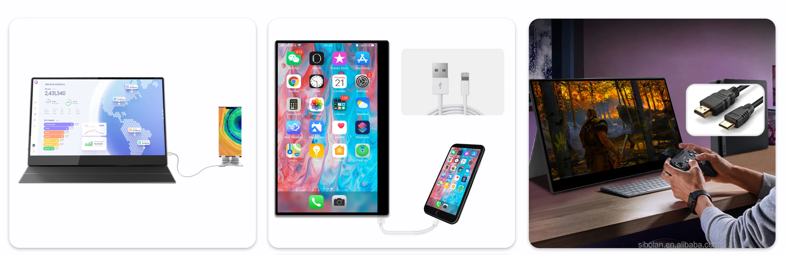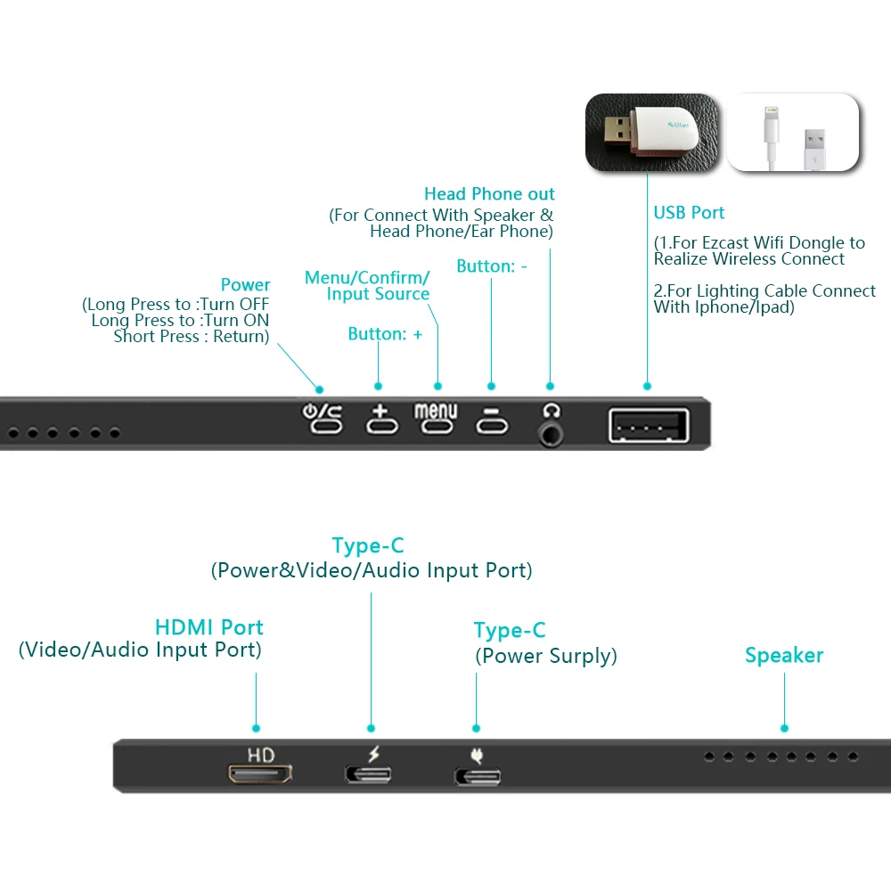 [Multi-Functional USB Type-c and USB Port]:Single Type-C Connect to Signal & Power This portable display features an innovative hybrid-signal solution with integrated a 3-in-1 function Type-C interface for simultaneous power, Type C port that support one usb-c cable to display & power.(Note:Please make sure your cellphone Type-c port supports audio and video signal transmission (USB 3.1 ), if not or Lightning and Micro USB port, you need a "light/Micro USB to HD" adapter for signal transmission.)USB Port