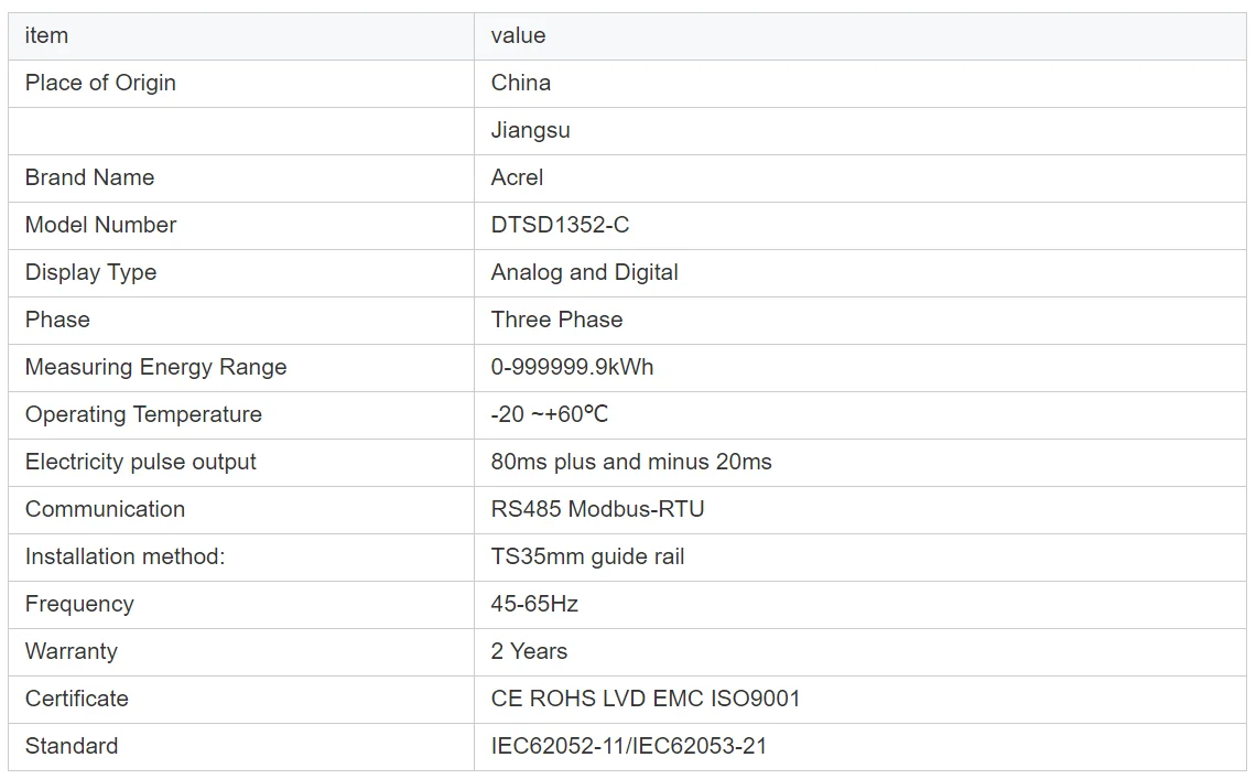 DDS/DDSD/DTSD series electronic energy meter is a new generation electric energy meter introduced by Acrel Electric. This series of energy meters use LCD display. The meters have power pulse output and can set parameters(such as clock, rate period and so on) except DDS1352; RS485 communication interface can be used to exchange data with the host computer, which greatly facilitates electricity automation management. This series of electric energy meters have the advantages of small size, high precision, good reliability and convenient installation. The products meet the requirements of national standard GB, T17215.321-2008 and enterprise standard Q31/0114000129C035-2017 " Enterprise Standard for Din Rail Energy Meter".