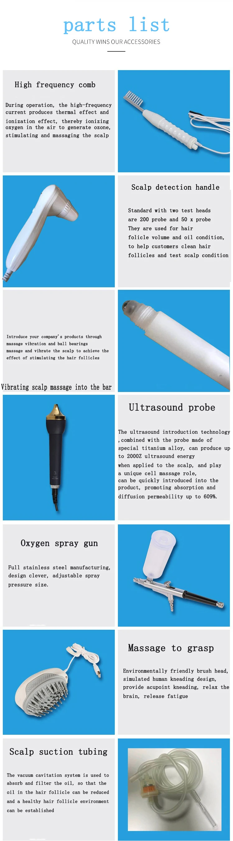 The machine combines high frequency, oxygen spray, hot therapy, hair analyzer and micro current technology. Can accelerate bloods circulation, promotion metabolism, promote cell regeneration, eliminate inflammation, repair hair roots, promote hair growth,black hair, hair loss fundamental change.