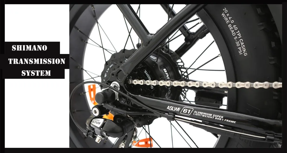 Our fat tire folding ebike use the highest quality transmission Shimano transmission.