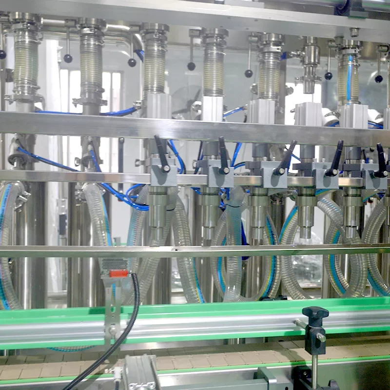 3 | Conveyor Belt (Dual power) | With double chain belts,divided into filling conveyor belt and capping jet code conveyor belt. The former is stop-and-go, and the latter is non-stop. They are interlaced and overlapped,operate independently,do not interfere with each other.Adopts frequency conversion speed regulation. The starting and stopping of the conveyor belt are buffered to ensure smooth conveying and prevent the phenomenon of pouring bottles and splashing oil.Large C guardrail, integral moulding, wear resistance, impact resistance, compact structure, smooth operation, cold shrinkage resistance, oxidation resistance. |