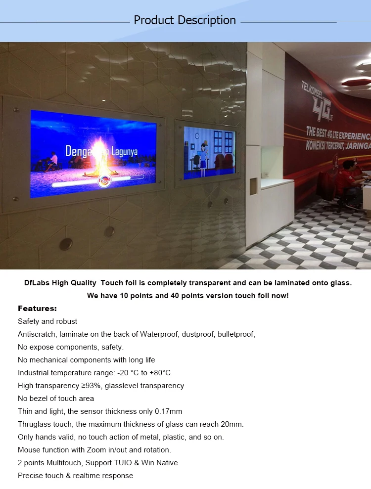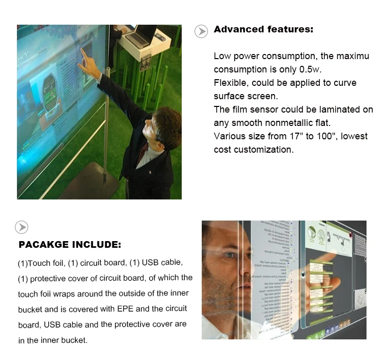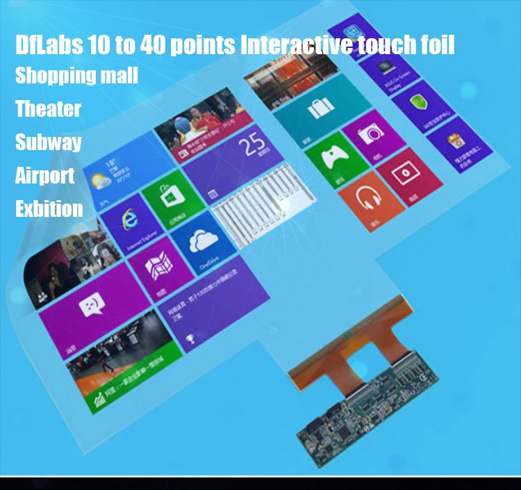 The Interactive Touch Foil, quickly enabling a touch screen in your ordinary glass world. 's large format flexible touch panel, cover from 30 to has 3 key parts. 1st is film sensor, 2nd is electronics controller, we call it eBoard, 3rd is driver. Film sensor is a green technology product, has high transparency, light and thin. the embedded nano wire grid is a sensor network, that can precisely positioning hands touch action. It use sensing technology, easily change an to bulletproof touch screen. eBoard use SoC architecture, so the PCB is small and strong noise filtering algorithm, It can detect weak signal that caused by hands.