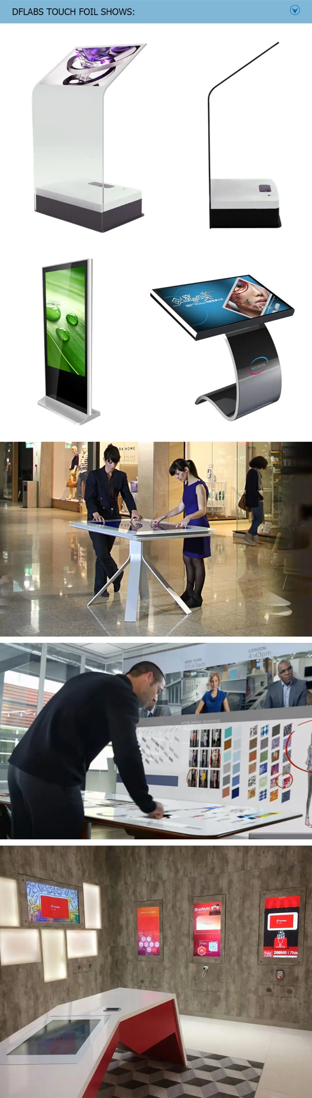 A: We provide many solutions to our partners; include all-in-one touch device, magic touch window, mirror touch, touch table, touch Kiosk, touch Digital Signage, interactive projection, touch wall, interactive ground, and so on.