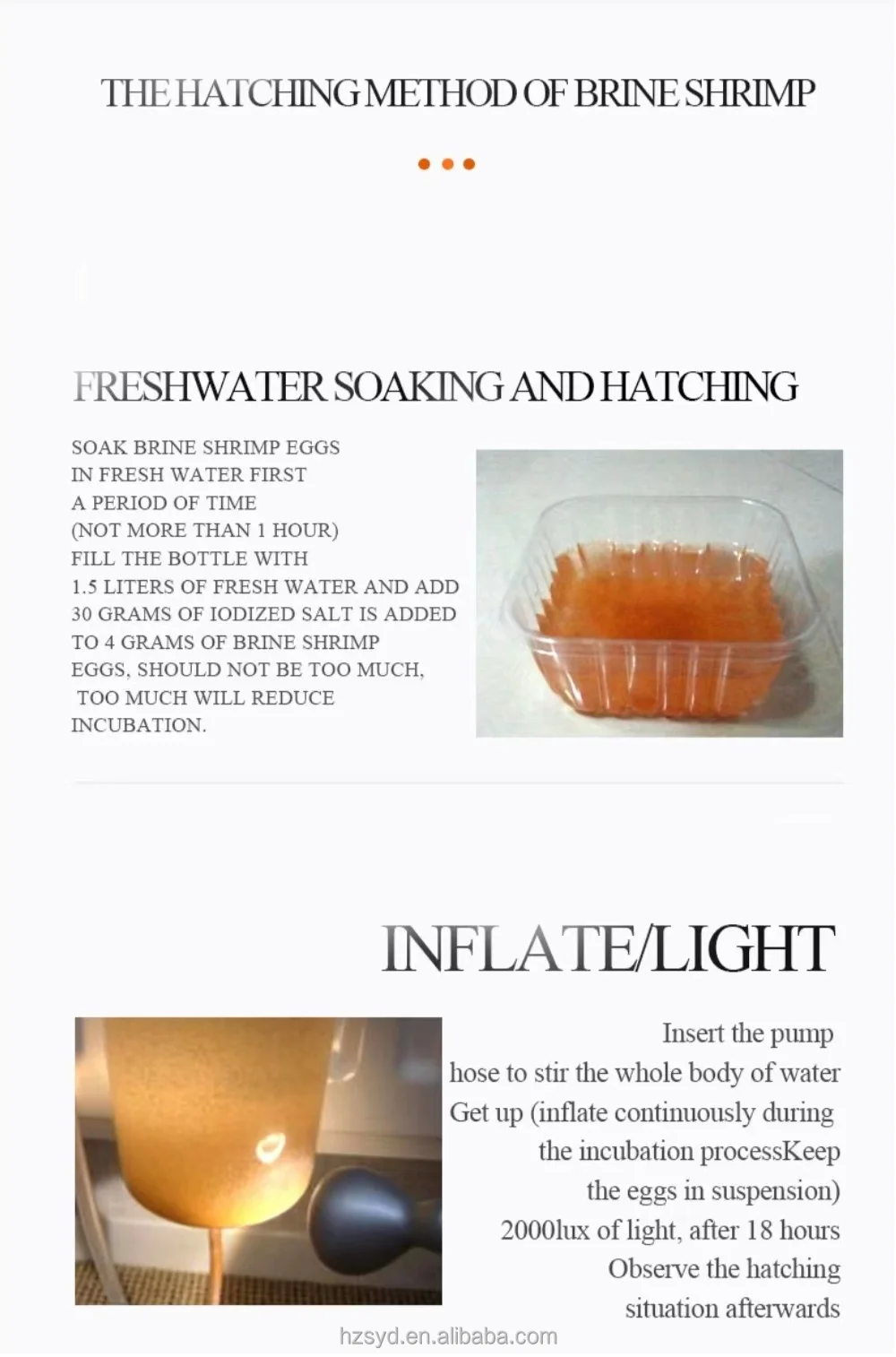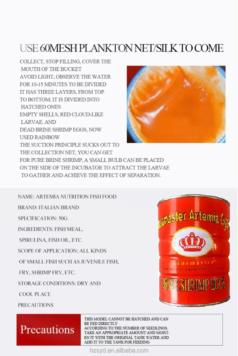 China Artemia Cysts harvest from China Bohai Bay salt ponds and the quality is better than U.S.A Great Salt Lake artemia and Russia artemia, especially for the nutrition and hatching rate, also China Bohai Bay Artemia Cysts the hatching rate is very stability, but the China Salt Lake(AIBI Lake)Artemia and Russia Artemia the hatching rate is not stability because of the cool weather in these area. •Guaranteed Analysis - Protein > 60%, Fat < 10%, Ash < 1%, Moisture < 9% •Hatching Criteria - Hatching density of two grams of cysts per liter of saltwater, 28° C-30 ° C incubation temperature, strong aeration and constant illumination over 24 hours. Cyst count is approximately 260,000-280,000 cysts per gram.