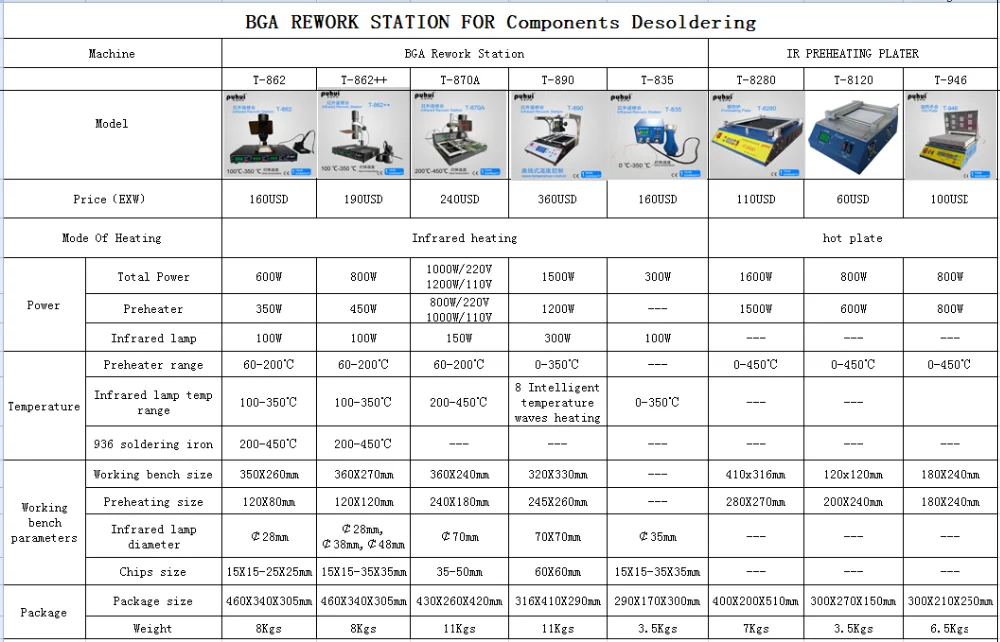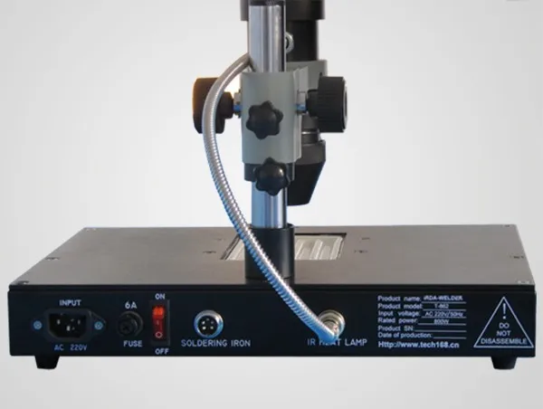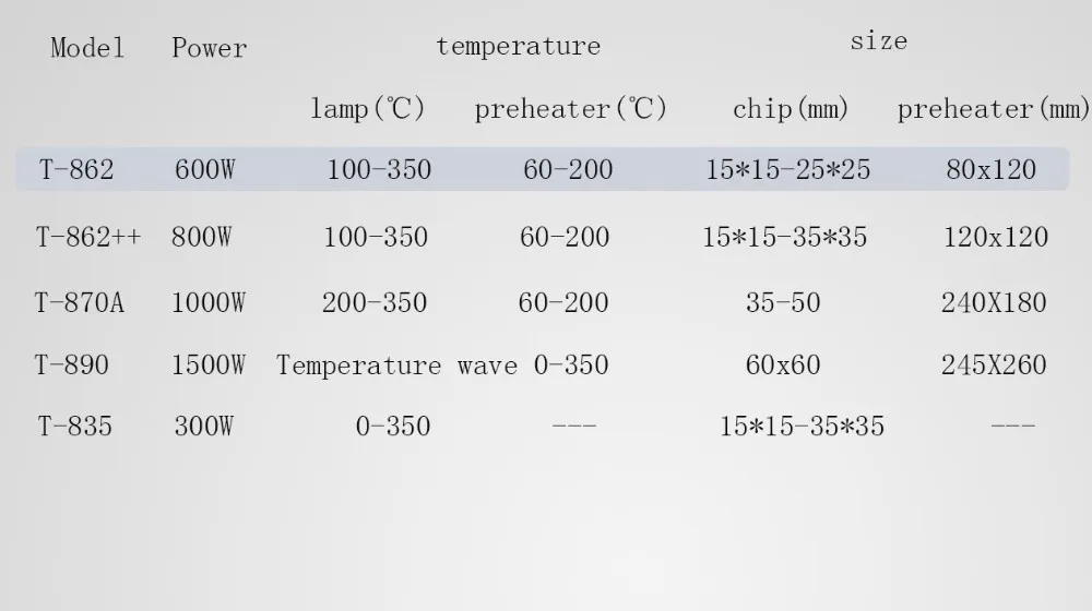 5.This rework station T862 has 350W hot-melt system. Its preheating area(BGA) is 80x120mm.