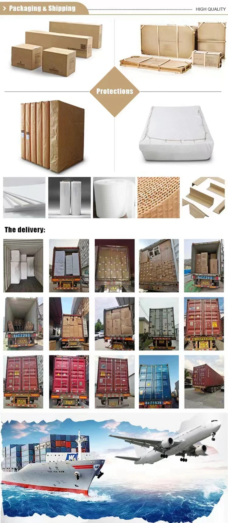 A. Ordinary paper packaging + EPE foam + carton Angle protection, used for cabinets, wooden tea tables, wooden dining tables, beds and other wooden furniture, wooden packaging is used for marble and glass furniture;