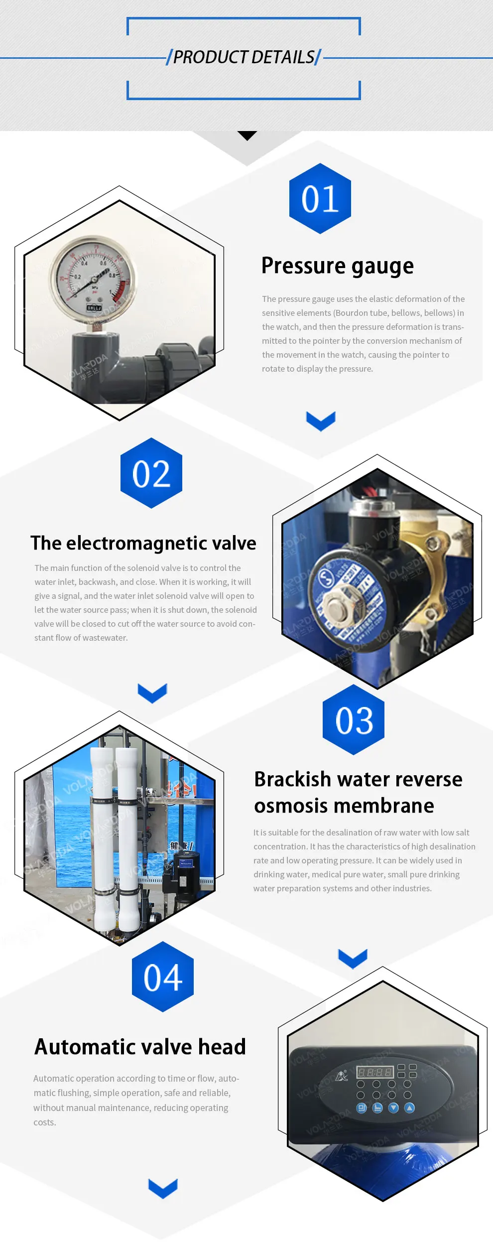 The main products of our Volardda are: Reverse Osmosis Systems,EDI Systems,Water sterilization products, pure water tank,Drinking Water Filling Machine, Household ro system,Pretreatment Systems, Ultrafiltration Systems, Water Softeners, Water treatment accessories etc. We have provided overall water treatment for more than 1,200 customers solution.