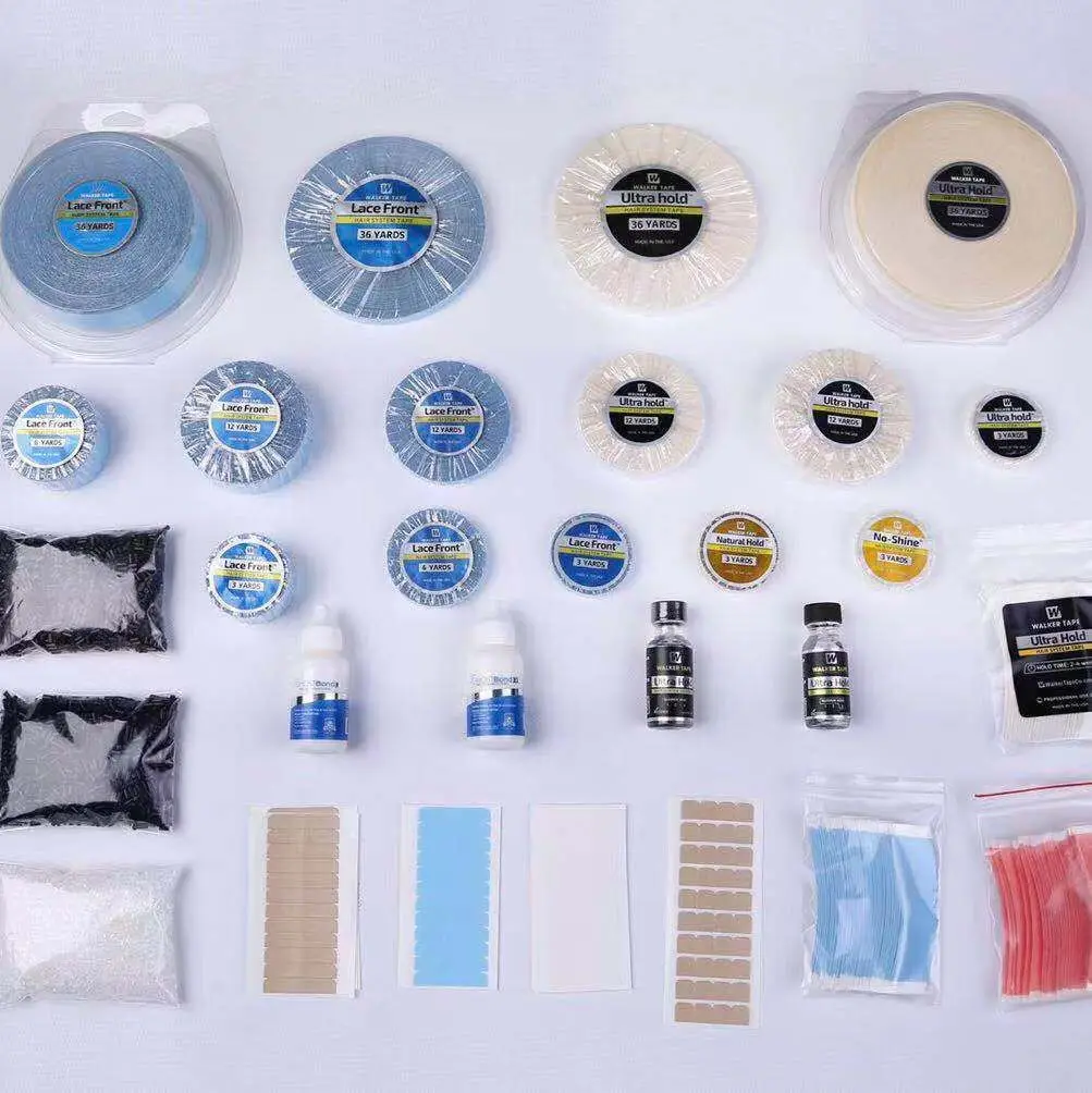 For the toupee/wig/hair piece,we have two types of the tape shape. 1.Tape roll available size: 1.2cm/1.9cm/2.54cm*3/6/12/36yards. Package:1rolls/plactic bag 2.Pre-cut Tape Available size:Cc/Straight Package: 36pcs/bag