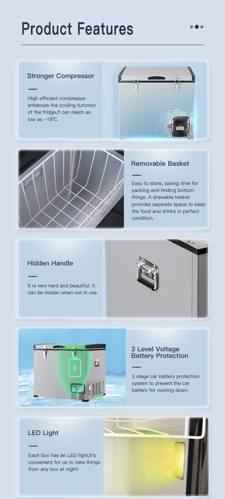 A.Before the car refrigerator leaves the factory, it has passed the test of Anti shock and anti shake.Therefore, the anti shock and anti shake performance is guaranteed. It can work perfectly in bumpy and high ambient temp situation.