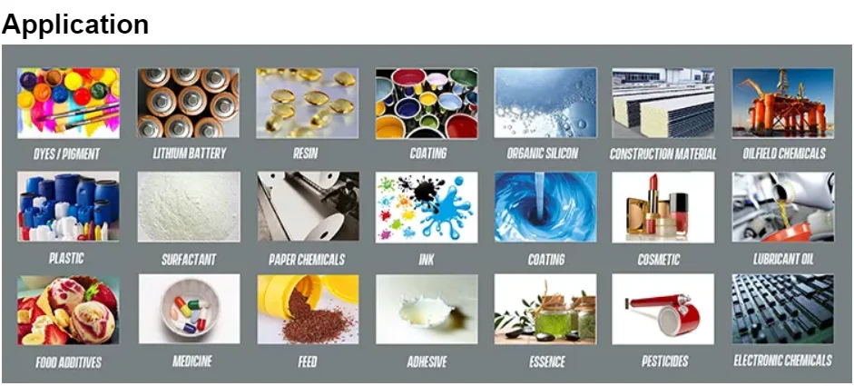 Major products include various specifications and types of reactor, dispersion, grinder, mixer, kneader,filter, emulsification and sets of equipment. These products serve a broad range of industries, including cosmetics, metallurgy,food-processing, pharmaceuticals, fodder, paper, paint, resin, construction, fertilizer and chemical industries.