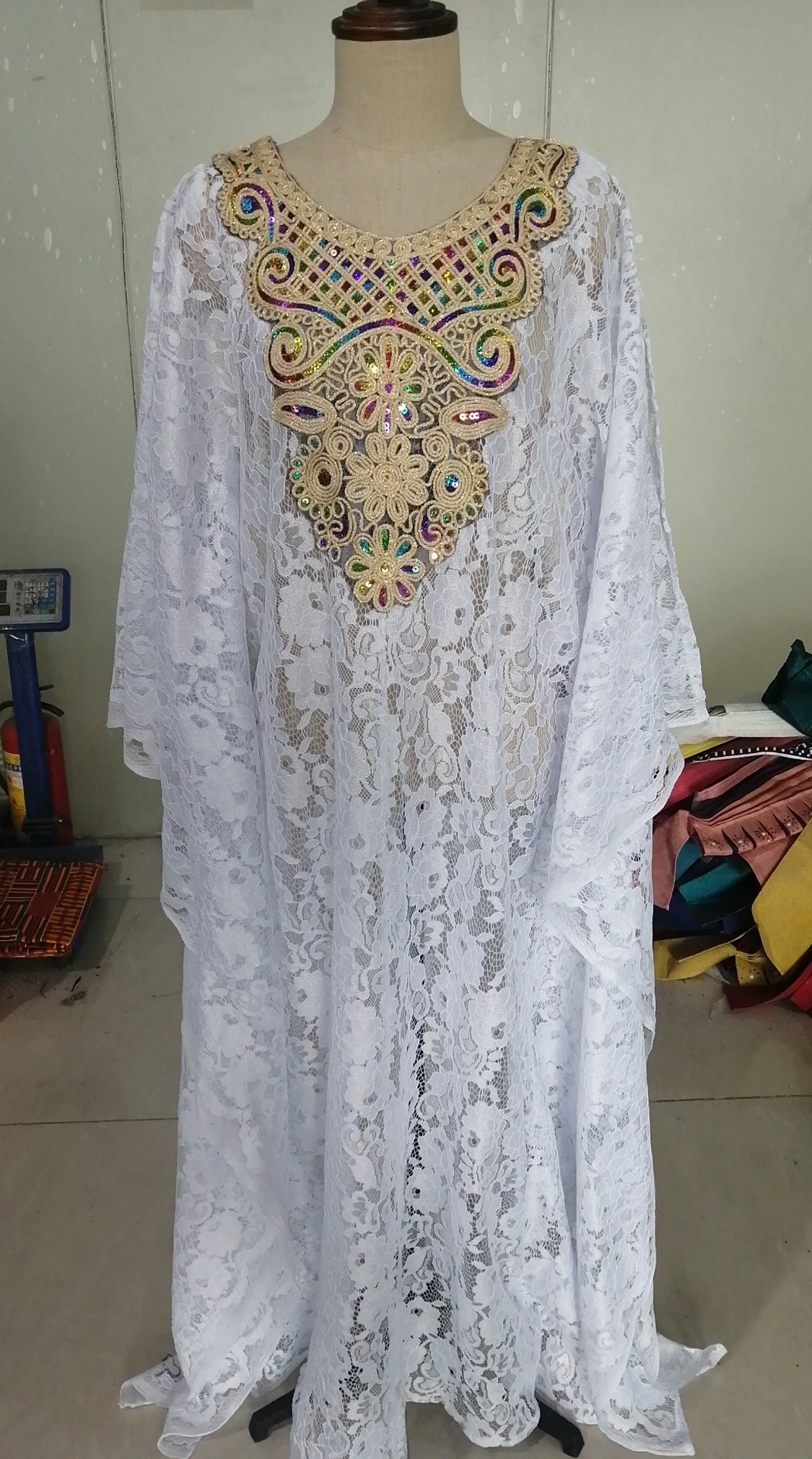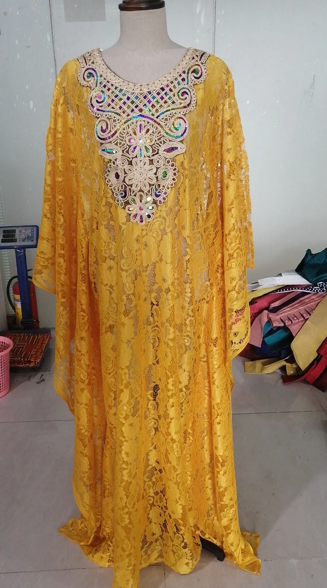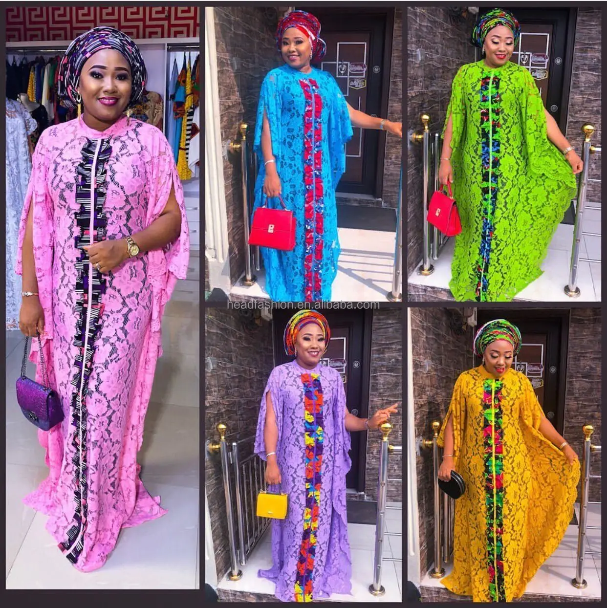 * A garment made of wax cloth and lace matching headtie to sale | Africa Embroidered French Fabric | |
