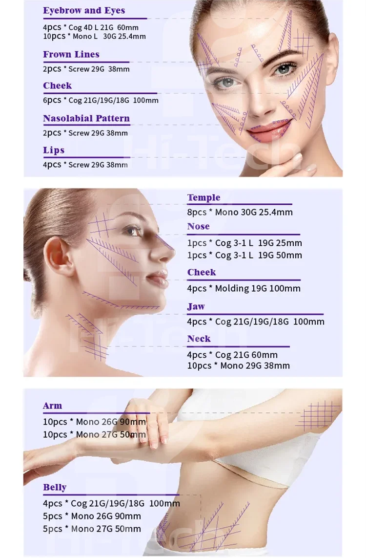 3d/4d /6d/8d cog | COG with 360 ° directional cogs acts to hold the skin like hook when the thread is pulled. It can be applied in the area of face for lifting. |