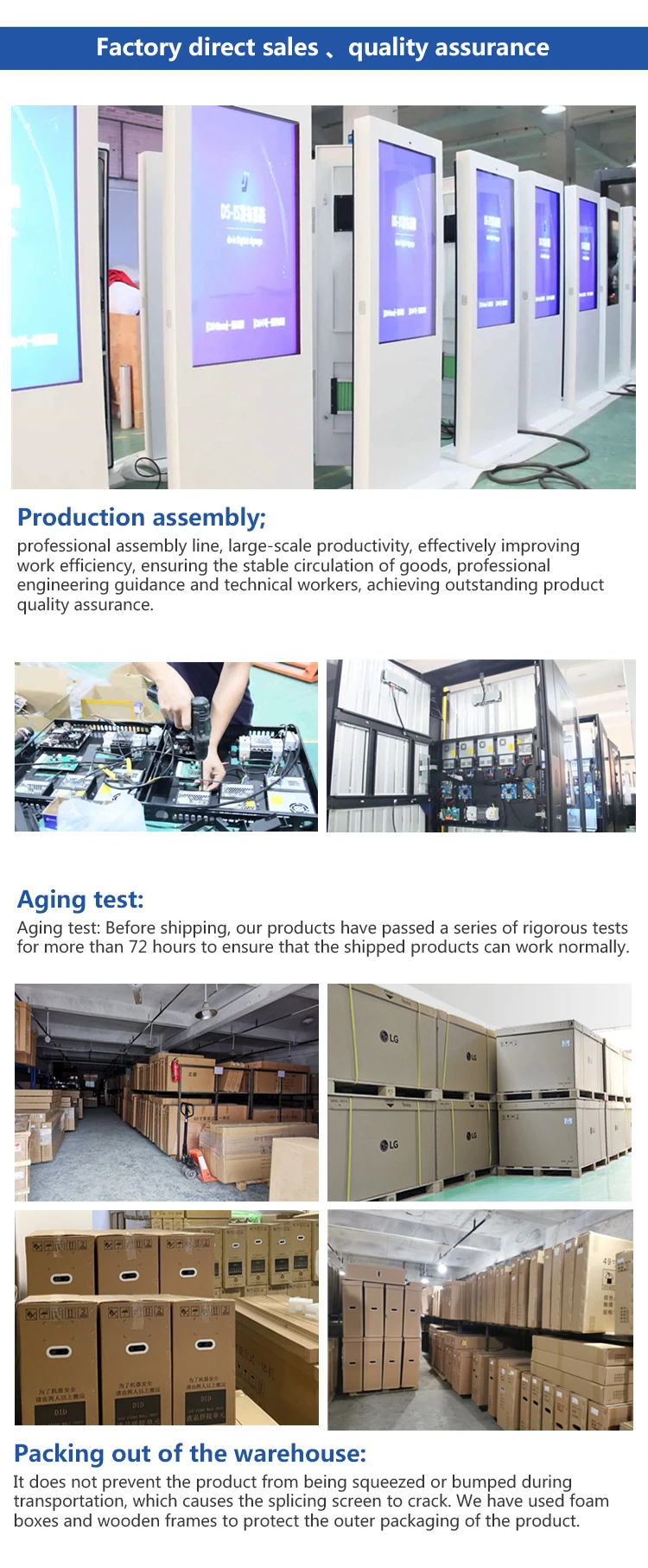 1.The outdoor advertising machine is strictly 24H power-on and aging before leaving the factory, and tests the performance of the main board, temperature control, ventilation and heat dissipation; 2.Outdoor anti-corrosion coating can be used normally for 3-7 years without external force damage. The waterproof performance reaches IPX5, and each unit is equipped with a lightning protection switch.