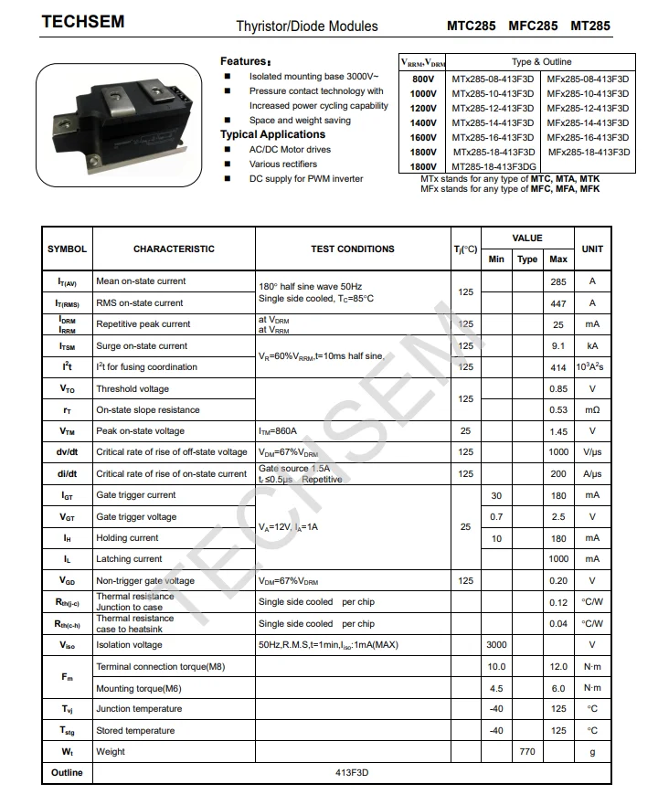 TECHSEM Module MTC285 16 413F3D MTC285A1600V 413F3D Diode Module IGBT MTC285 18 413F3D MTC285 16 Thyristor Module