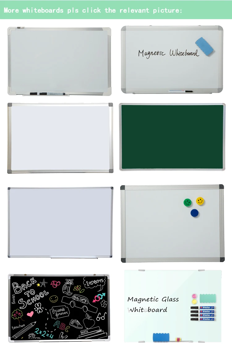| Whiteboard Material | Surface: lacquered steel panel Core: 7 layer corrugated cardboard, thickness is 9mm Back: anti-rust color coated galvanized steel panel Thickened and hardened 97# black aluminum frame, the aluminum edge itself is 0.6mm thick and the thickness and the width of the aluminum frame is 20mm and 23mm With portable aluminum pen holder |
