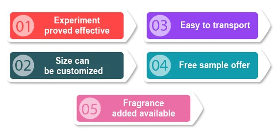1. Prepare all materials in factory 2. Mixing and heating material in machine 3. Add active ingredients on fabric 4. Drying fabric on machine 5. Cutting the fabric to required size 6. Packing products with color box 7. Inspection after production is finished 8. Store finished goods in warehouse 9. Loading carefully in container