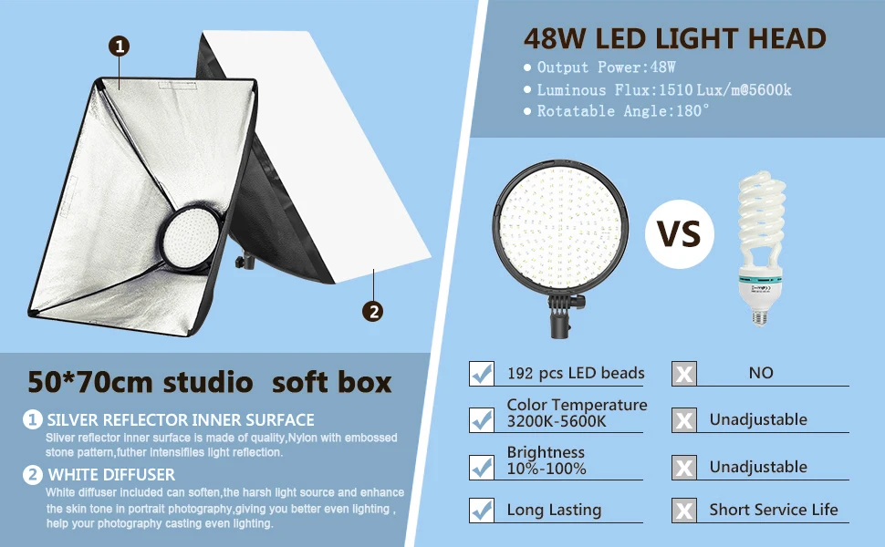*Softbox Lighting Kit: Featuring 192 LED bulbs, adjustable color temperature (3200K–5600K) and adjustable brightness (10%–100%), this lighting kit is perfect for portrait/product photography, YouTube vlogging, home studio